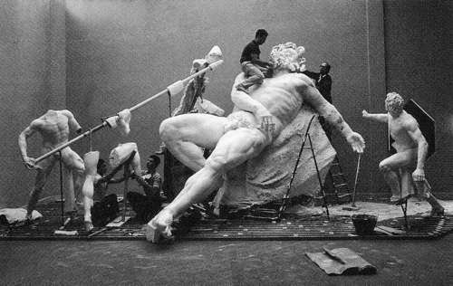 I found Antin’s account of her work especially compelling when considered alongside what surely must have been a guiding source for its striking composition – although I have not been able to find other discussions of this comparison to back me up: the gigantic sculpture of Odysseus blinding the cyclops, Polyphemus, in the emperor Tiberius’ grotto-cum-dining room in Sperlonga (below). In fact, a photograph of the sculpture’s restoration – for which I sadly could not find a date – in which the two restorers an be seen occupying comparable positions to two of the artists in Antin’s work, could have been the precise source for her work.