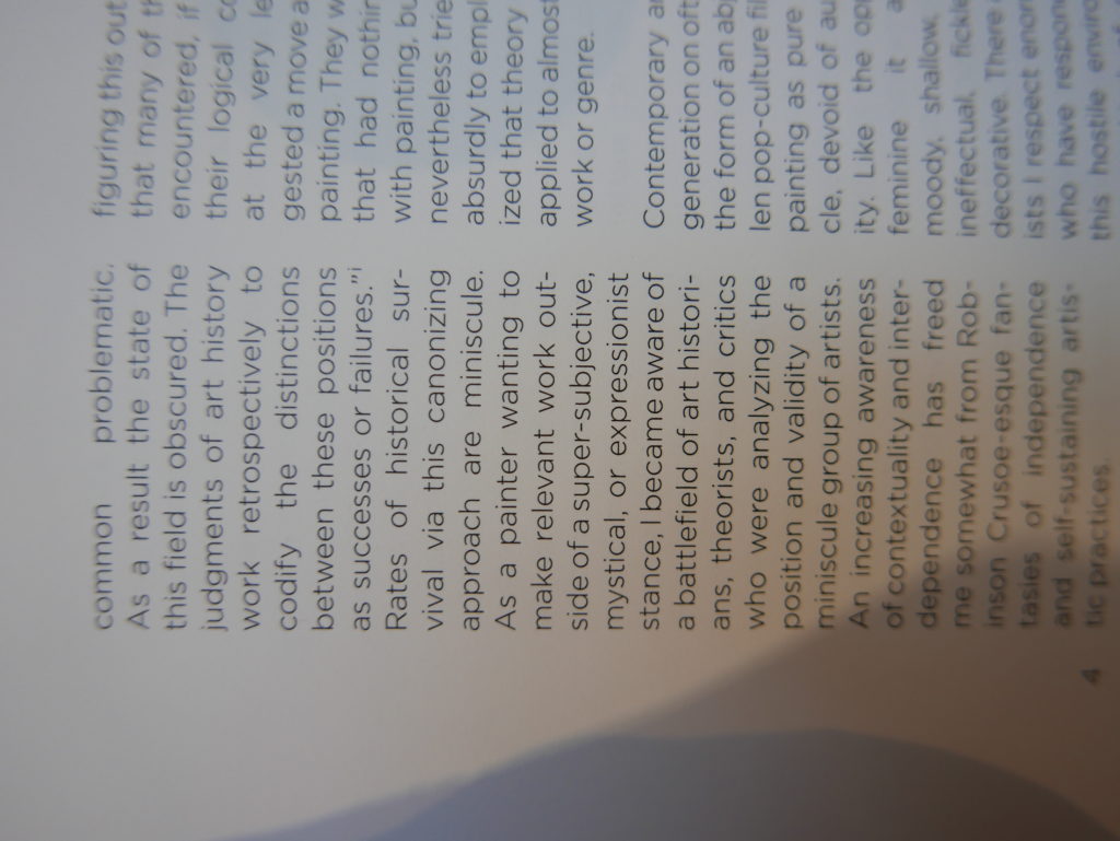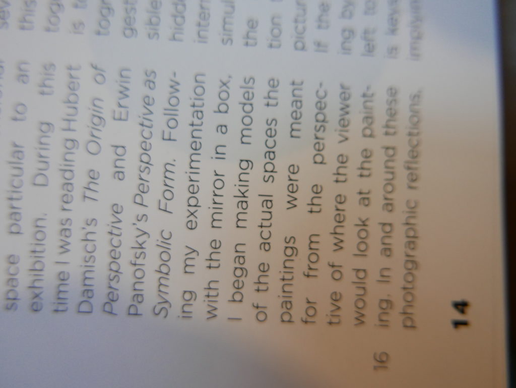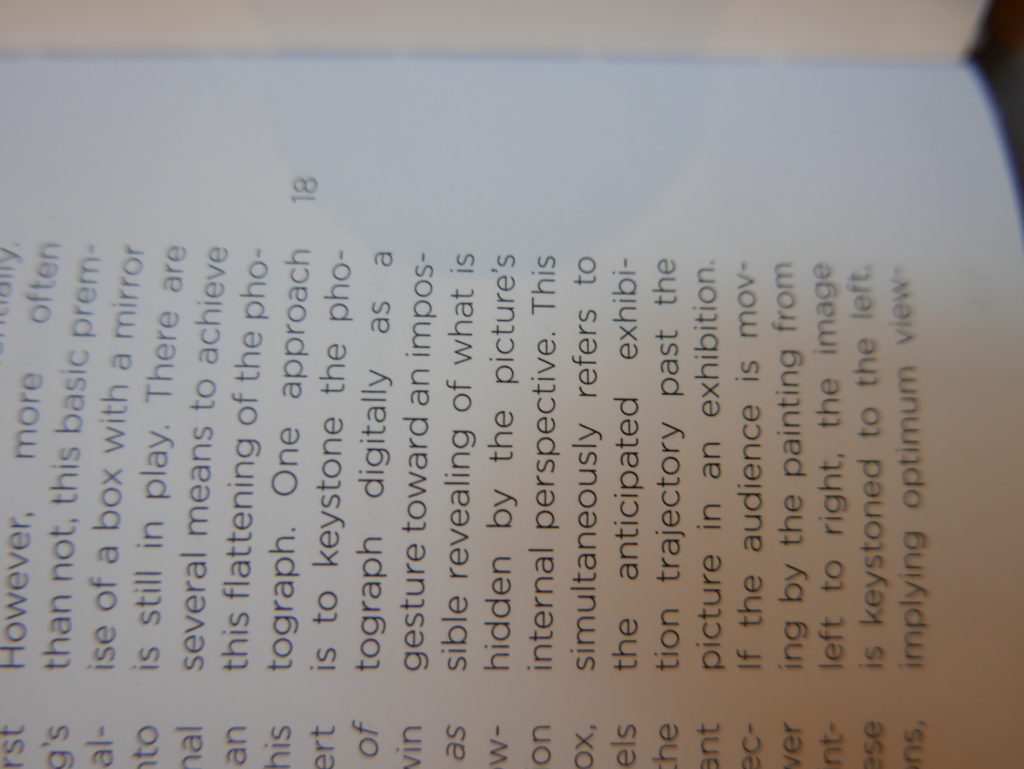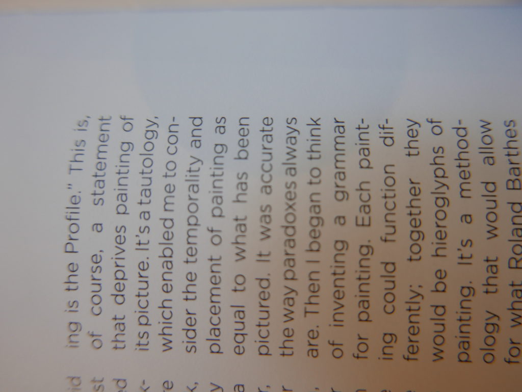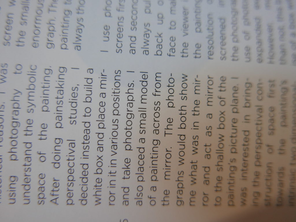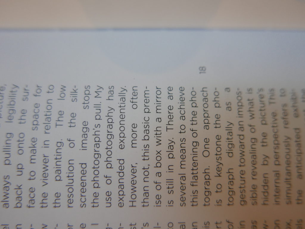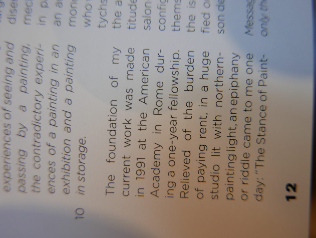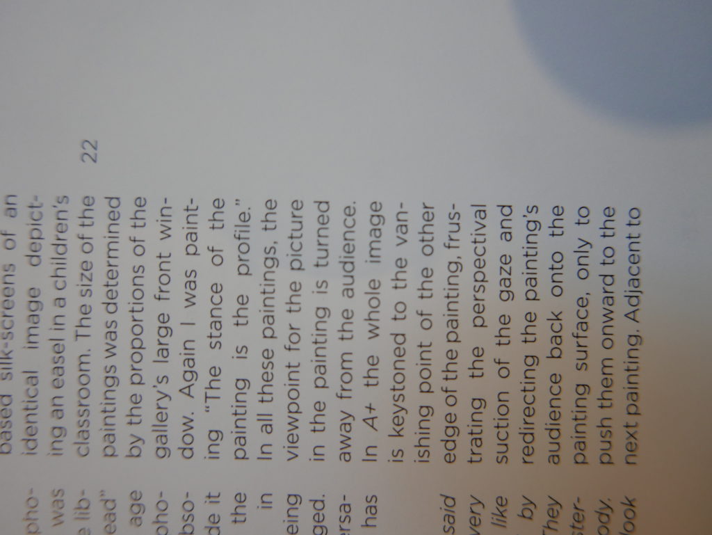 The only way I could get my hands on R. H. Quaytman’s early book-work Allegorical Decoys was by the circuitous route of Ohio State Libraries’ Interlibrary Loan system. When it finally arrived this morning, I discovered that I was not able to check the book out of the library and so I had to read it there and then on the spot. Knowing that I would want to return to the opening essay, I decided to take a series of snapshots of overlapping sections of the text. There are many things to say about this text, but I was especially drawn to Quaytman’s description of her time at the American Academy in Rome. It was there that she initiated her series of works as chapters as a response to what she describes as ‘painting’s status as an isolated target of a monocular and disembodied eye’. She continues to unpack this metaphor by evoking the monstrous figure of the Cyclops: ‘What mechanisms are at work in painting that assume an audience of one male monogamous Cyclops who will never leave?’. In the spirit of Quaytman’s attack on Cyclopean forms, here is a slide show of my multi-perspective photographs of her essay.