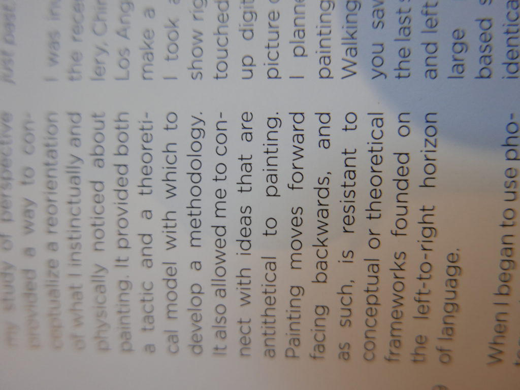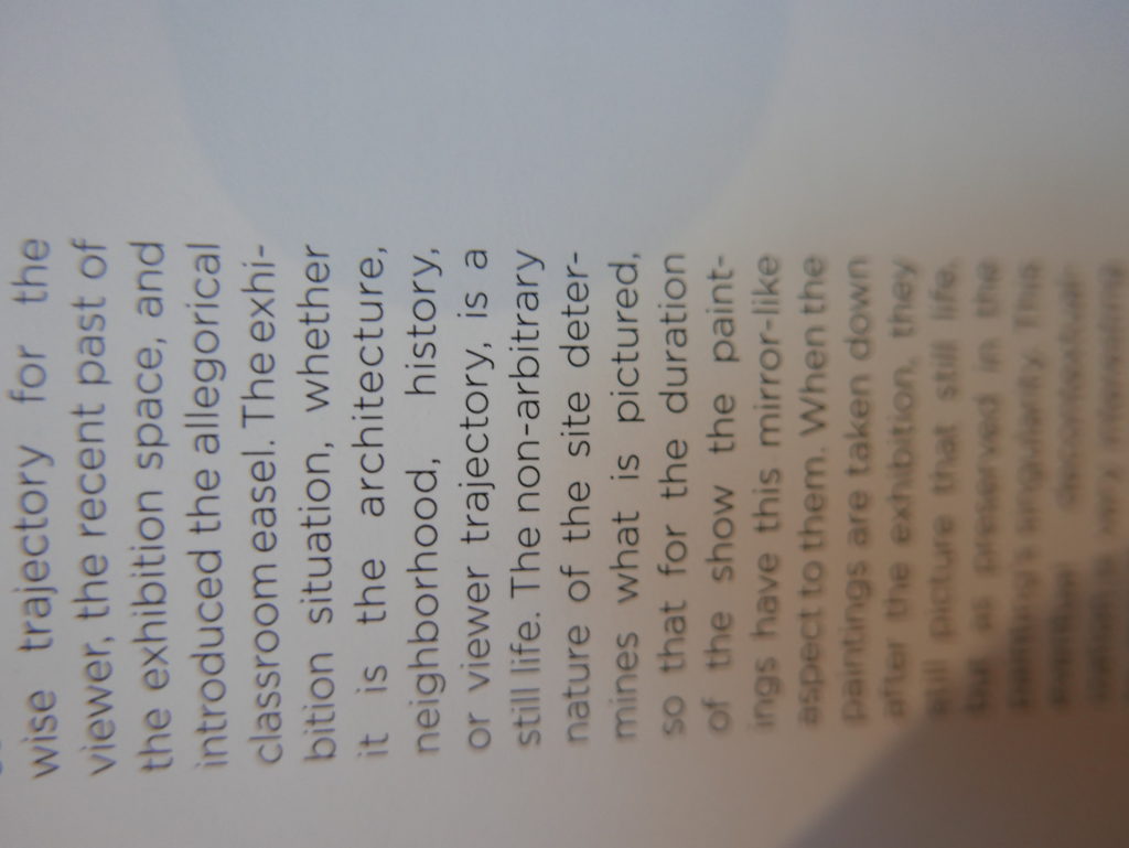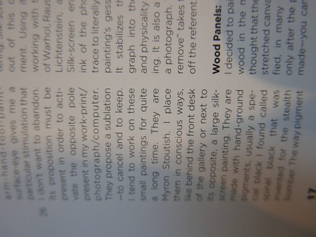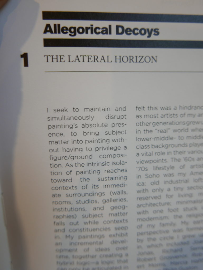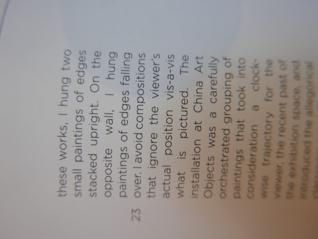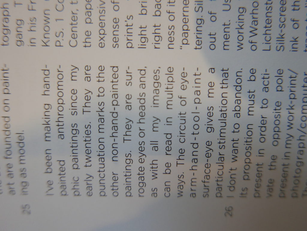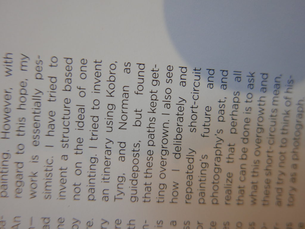 The only way I could get my hands on R. H. Quaytman’s early book-work Allegorical Decoys was by the circuitous route of Ohio State Libraries’ Interlibrary Loan system. When it finally arrived this morning, I discovered that I was not able to check the book out of the library and so I had to read it there and then on the spot. Knowing that I would want to return to the opening essay, I decided to take a series of snapshots of overlapping sections of the text. There are many things to say about this text, but I was especially drawn to Quaytman’s description of her time at the American Academy in Rome. It was there that she initiated her series of works as chapters as a response to what she describes as ‘painting’s status as an isolated target of a monocular and disembodied eye’. She continues to unpack this metaphor by evoking the monstrous figure of the Cyclops: ‘What mechanisms are at work in painting that assume an audience of one male monogamous Cyclops who will never leave?’. In the spirit of Quaytman’s attack on Cyclopean forms, here is a slide show of my multi-perspective photographs of her essay.