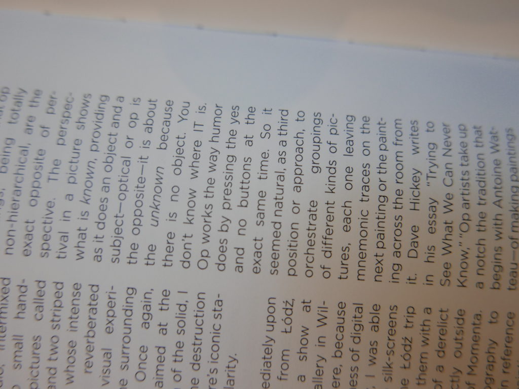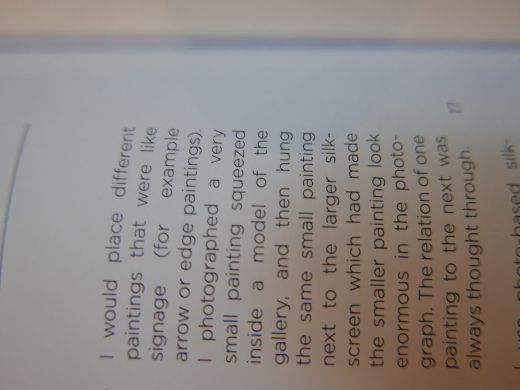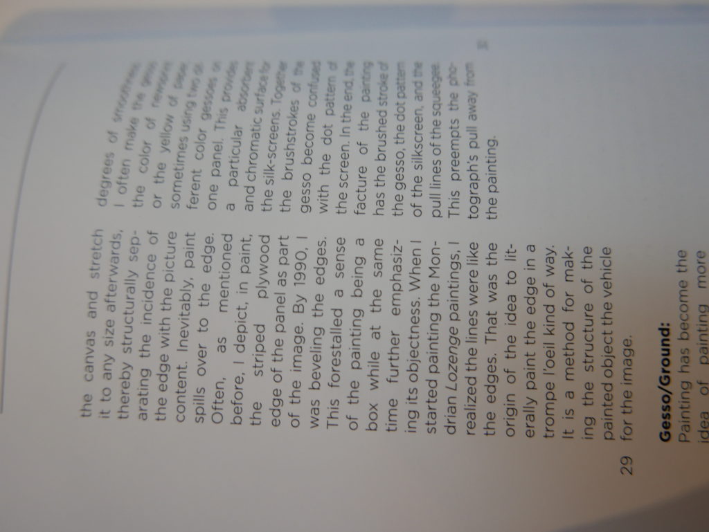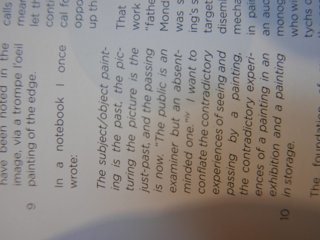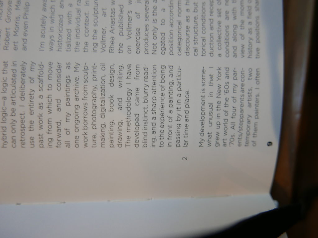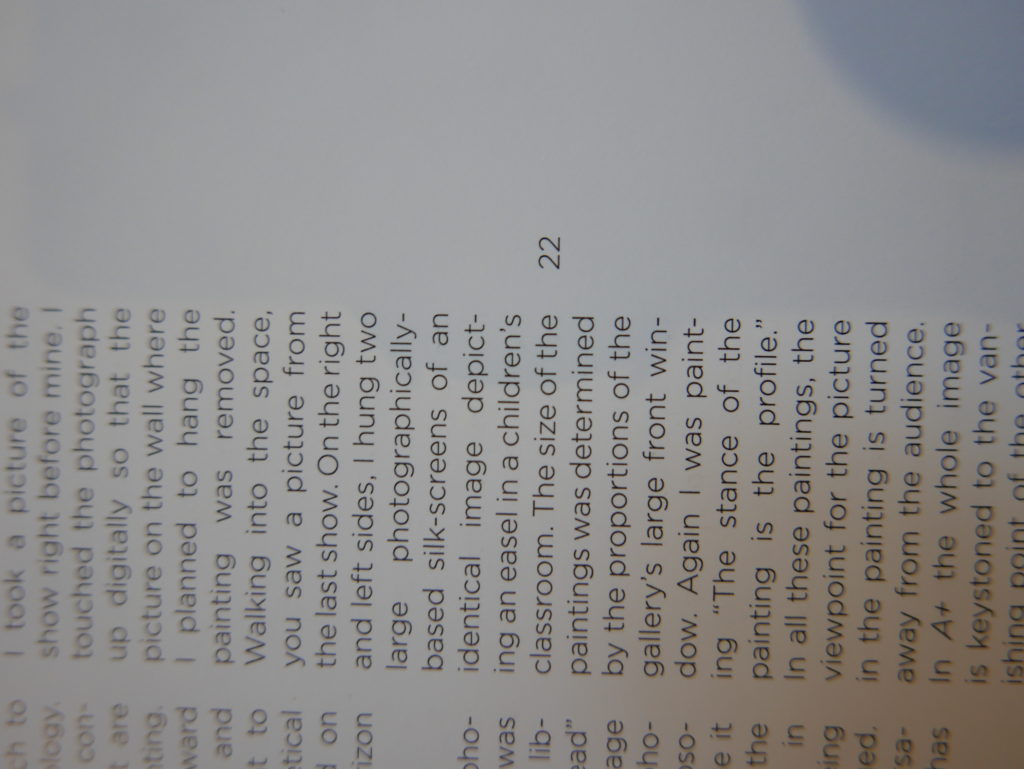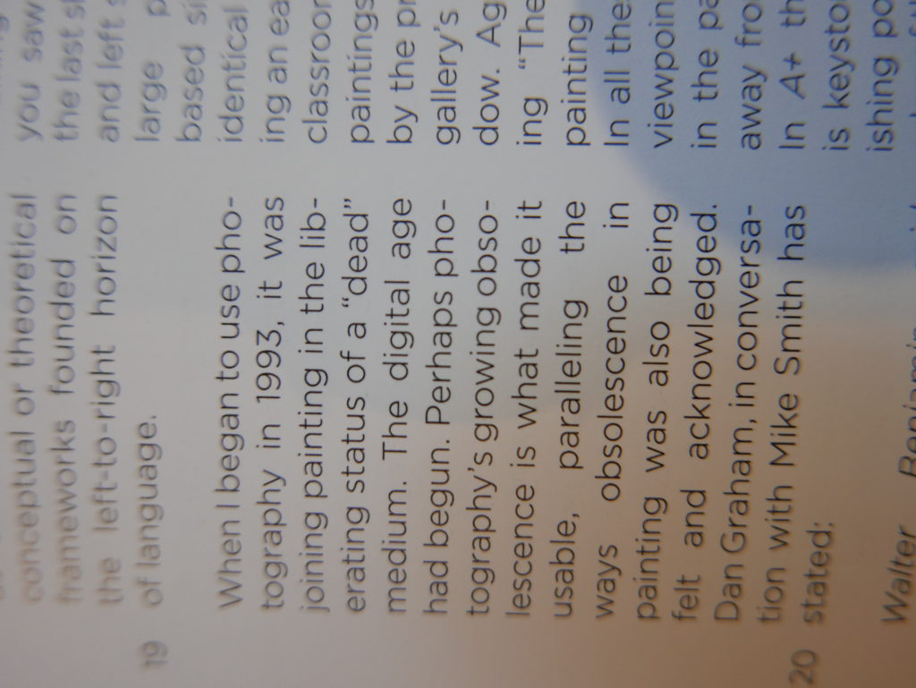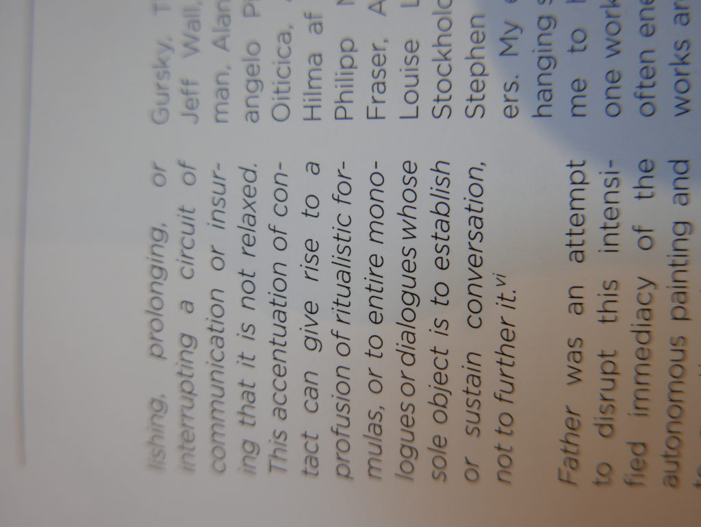 The only way I could get my hands on R. H. Quaytman’s early book-work Allegorical Decoys was by the circuitous route of Ohio State Libraries’ Interlibrary Loan system. When it finally arrived this morning, I discovered that I was not able to check the book out of the library and so I had to read it there and then on the spot. Knowing that I would want to return to the opening essay, I decided to take a series of snapshots of overlapping sections of the text. There are many things to say about this text, but I was especially drawn to Quaytman’s description of her time at the American Academy in Rome. It was there that she initiated her series of works as chapters as a response to what she describes as ‘painting’s status as an isolated target of a monocular and disembodied eye’. She continues to unpack this metaphor by evoking the monstrous figure of the Cyclops: ‘What mechanisms are at work in painting that assume an audience of one male monogamous Cyclops who will never leave?’. In the spirit of Quaytman’s attack on Cyclopean forms, here is a slide show of my multi-perspective photographs of her essay.