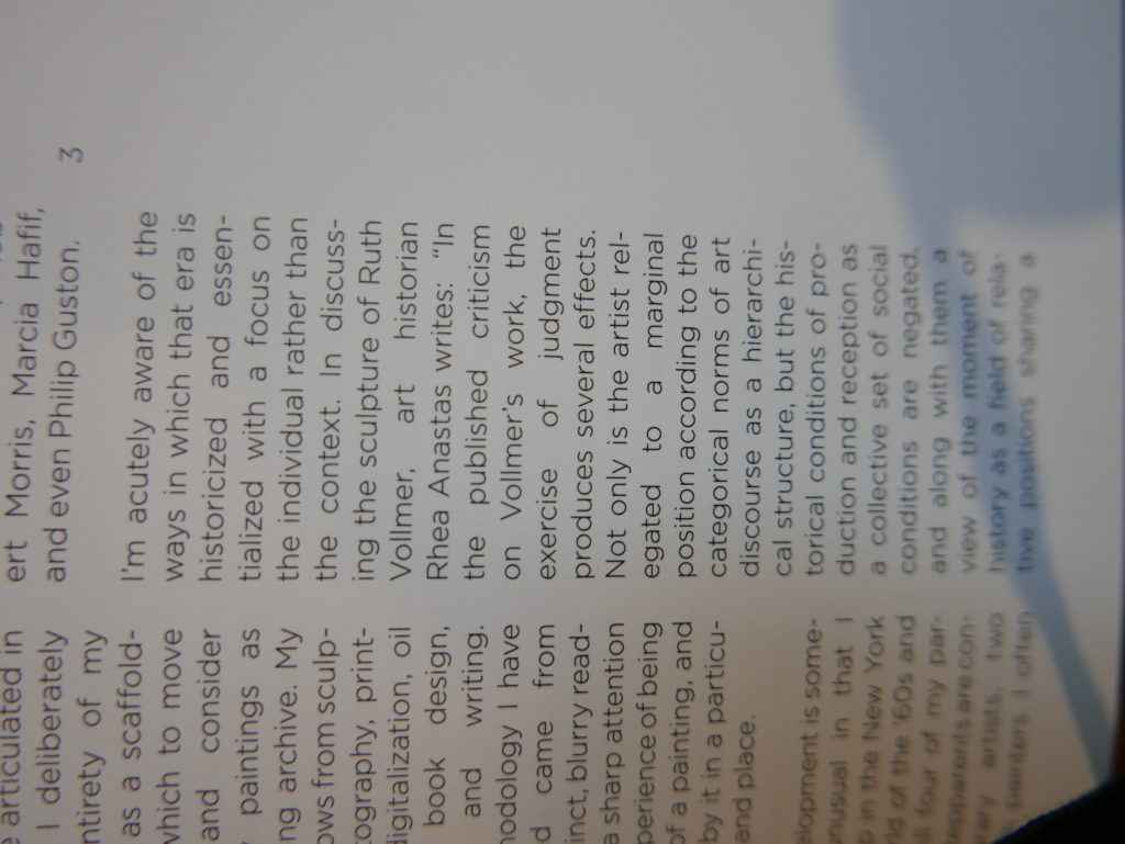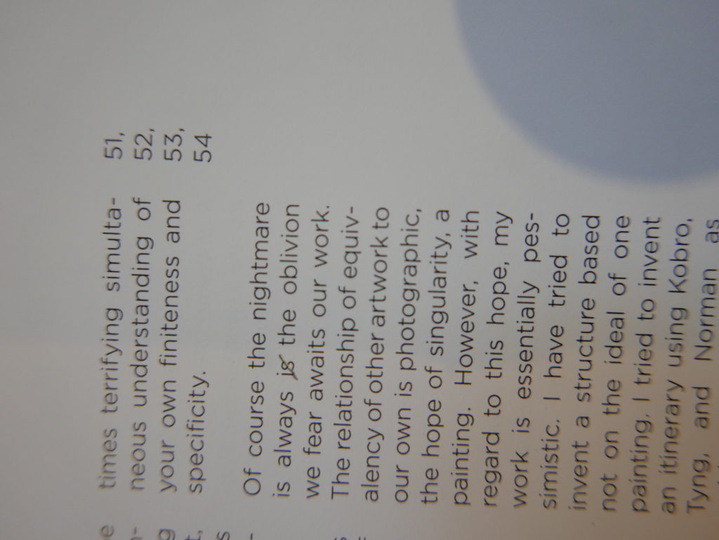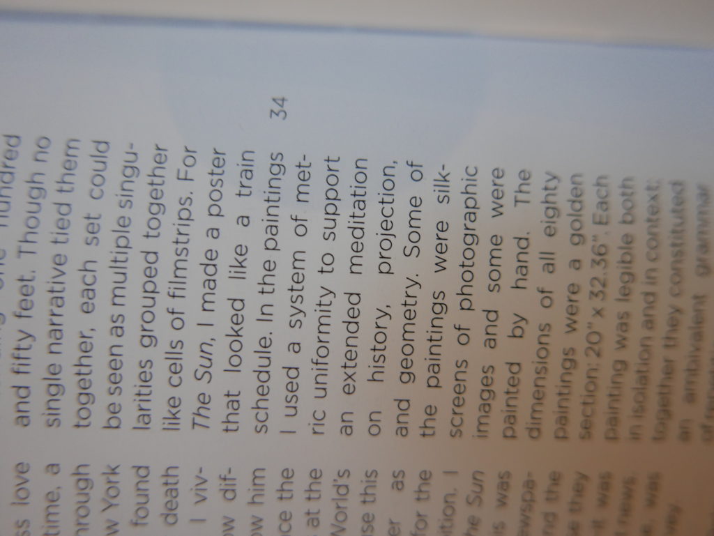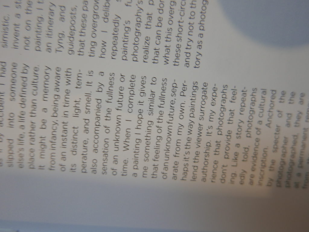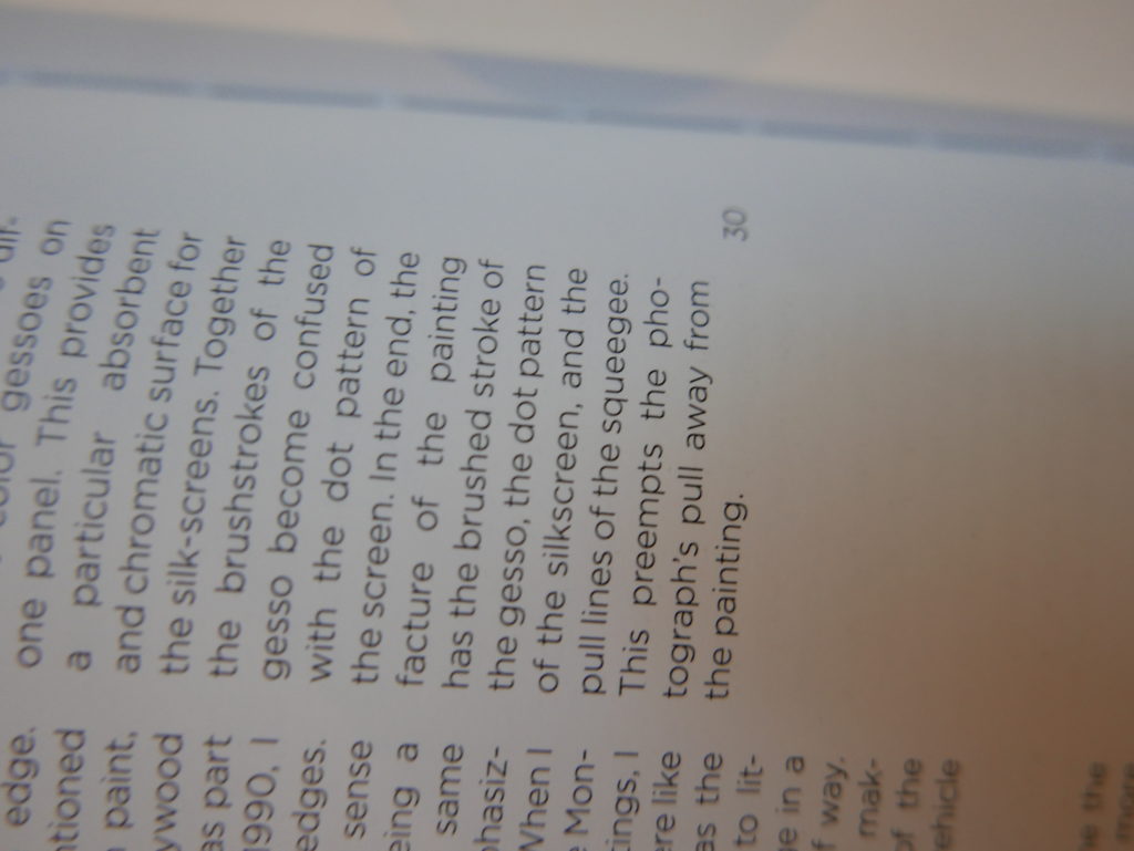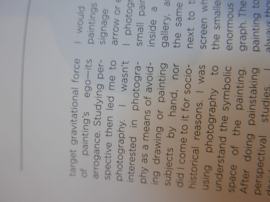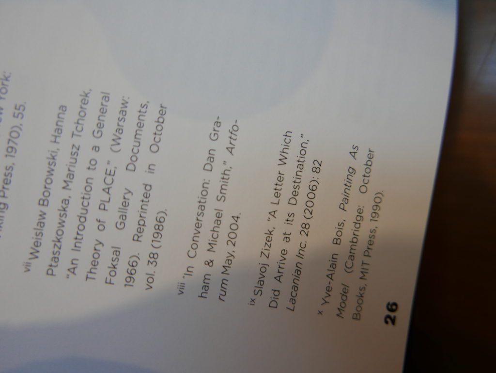 The only way I could get my hands on R. H. Quaytman’s early book-work Allegorical Decoys was by the circuitous route of Ohio State Libraries’ Interlibrary Loan system. When it finally arrived this morning, I discovered that I was not able to check the book out of the library and so I had to read it there and then on the spot. Knowing that I would want to return to the opening essay, I decided to take a series of snapshots of overlapping sections of the text. There are many things to say about this text, but I was especially drawn to Quaytman’s description of her time at the American Academy in Rome. It was there that she initiated her series of works as chapters as a response to what she describes as ‘painting’s status as an isolated target of a monocular and disembodied eye’. She continues to unpack this metaphor by evoking the monstrous figure of the Cyclops: ‘What mechanisms are at work in painting that assume an audience of one male monogamous Cyclops who will never leave?’. In the spirit of Quaytman’s attack on Cyclopean forms, here is a slide show of my multi-perspective photographs of her essay.