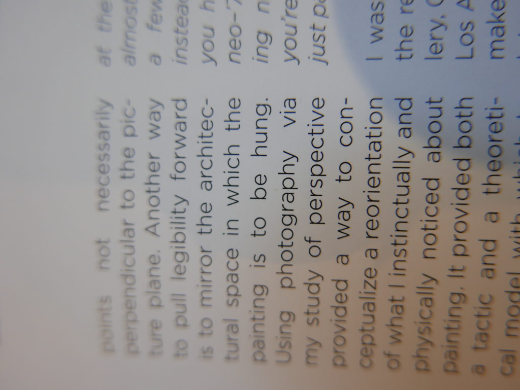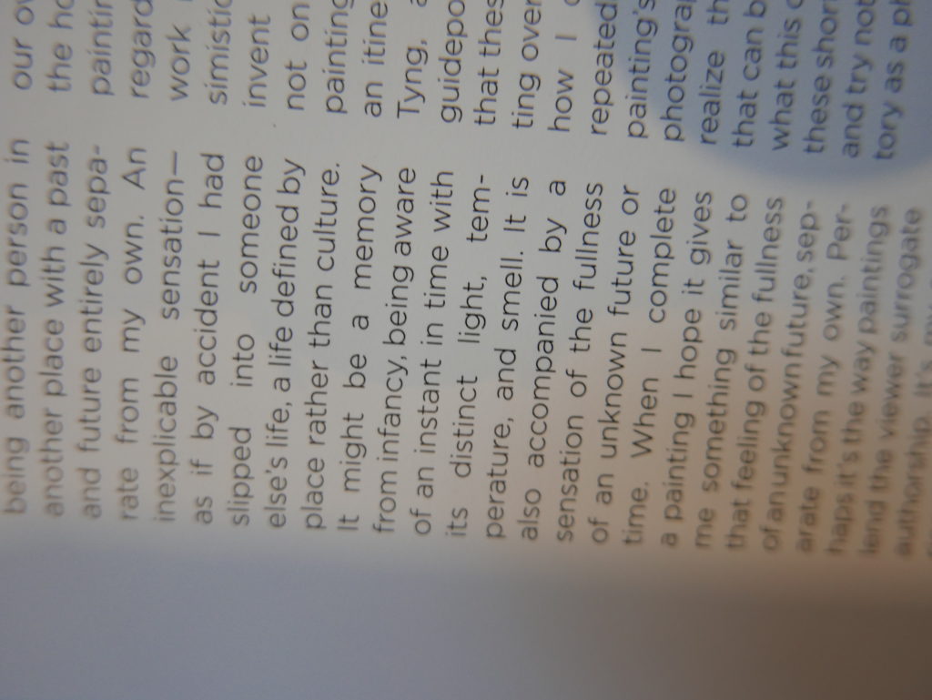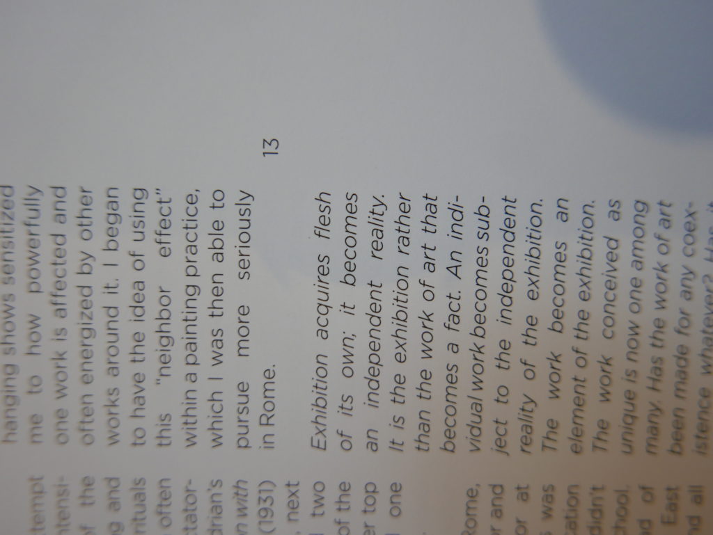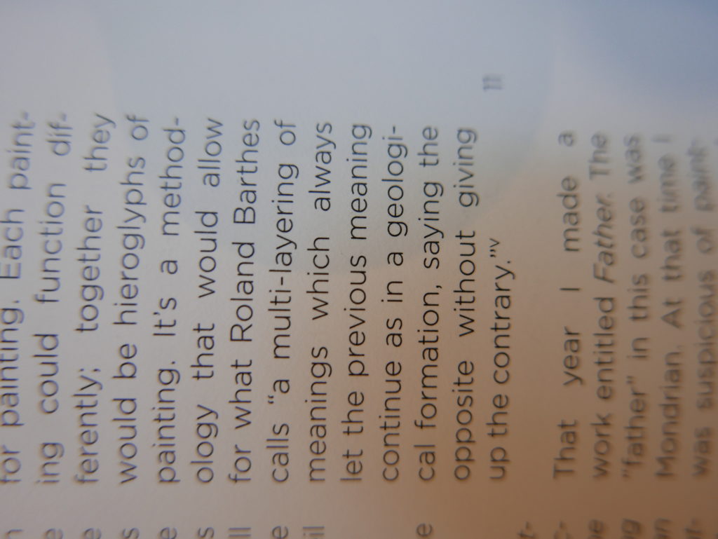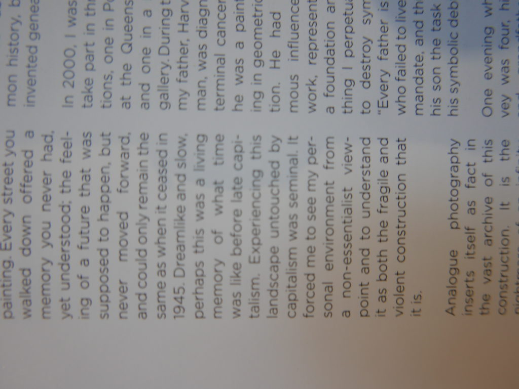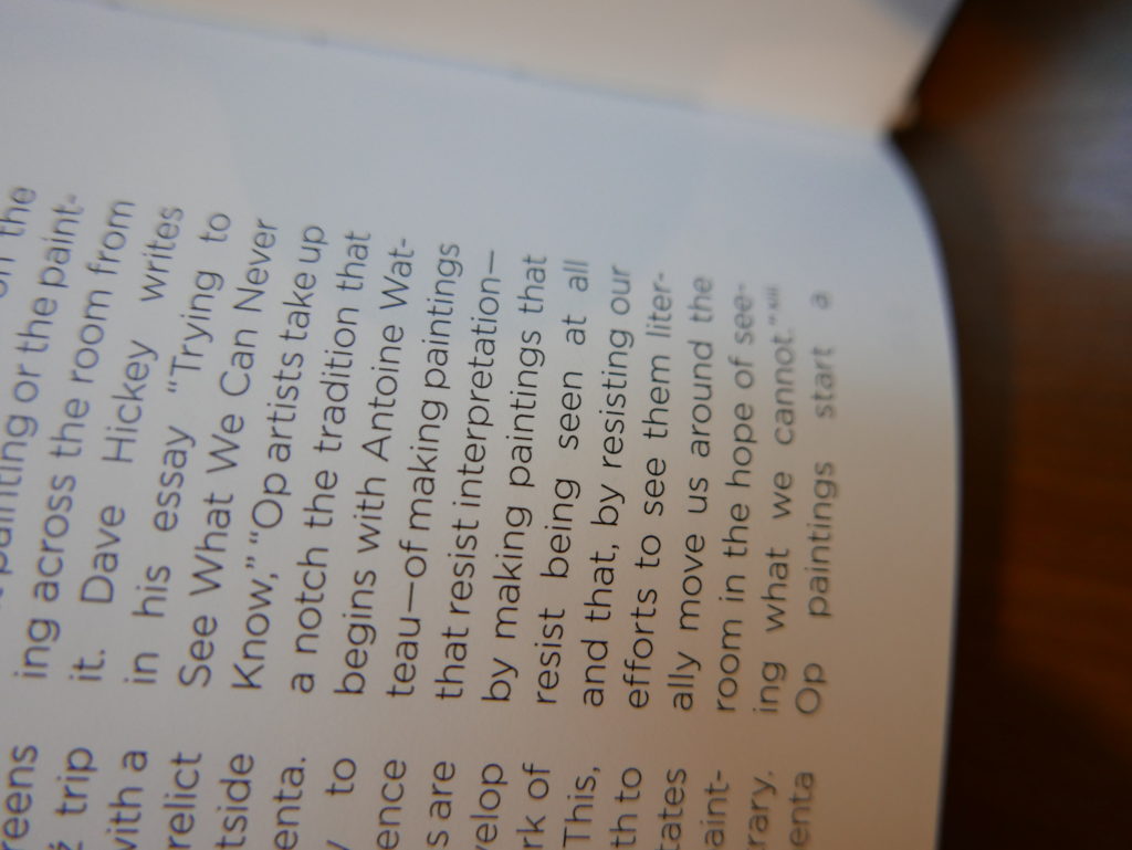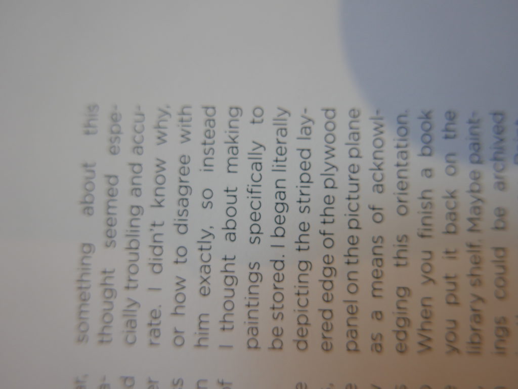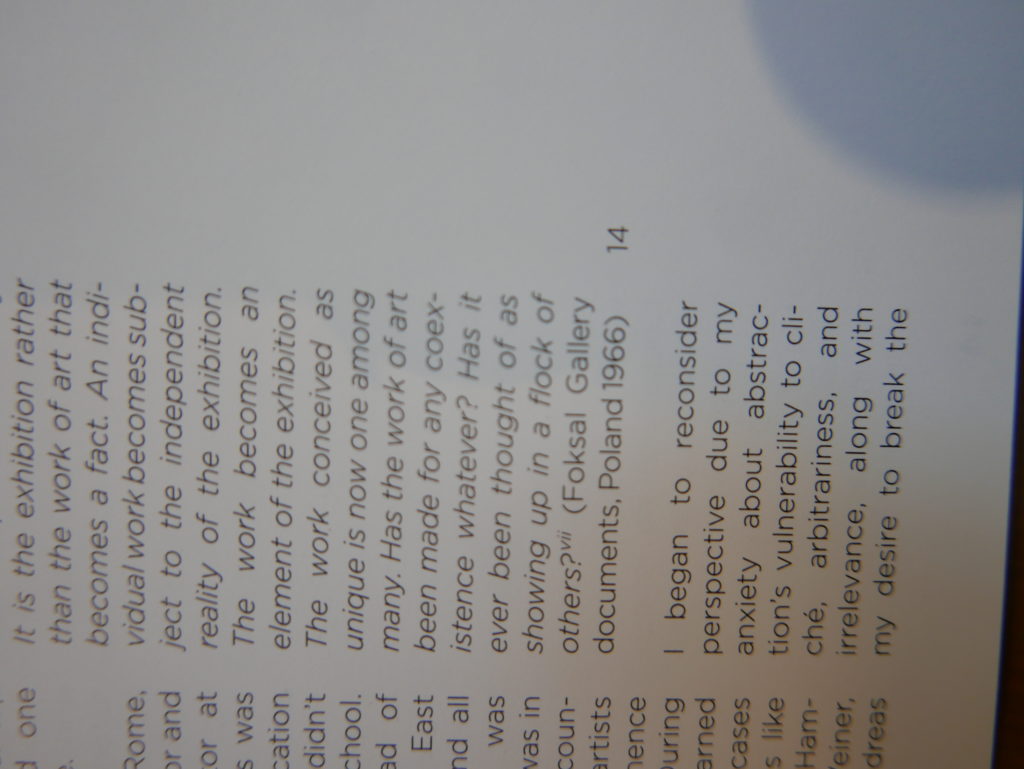The only way I could get my hands on R. H. Quaytman’s early book-work Allegorical Decoys was by the circuitous route of Ohio State Libraries’ Interlibrary Loan system. When it finally arrived this morning, I discovered that I was not able to check the book out of the library and so I had to read it there and then on the spot. Knowing that I would want to return to the opening essay, I decided to take a series of snapshots of overlapping sections of the text. There are many things to say about this text, but I was especially drawn to Quaytman’s description of her time at the American Academy in Rome. It was there that she initiated her series of works as chapters as a response to what she describes as ‘painting’s status as an isolated target of a monocular and disembodied eye’. She continues to unpack this metaphor by evoking the monstrous figure of the Cyclops: ‘What mechanisms are at work in painting that assume an audience of one male monogamous Cyclops who will never leave?’. In the spirit of Quaytman’s attack on Cyclopean forms, here is a slide show of my multi-perspective photographs of her essay.