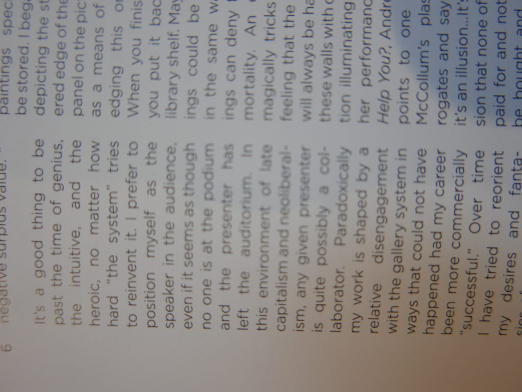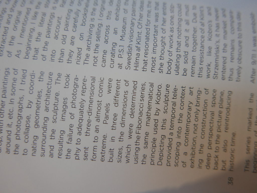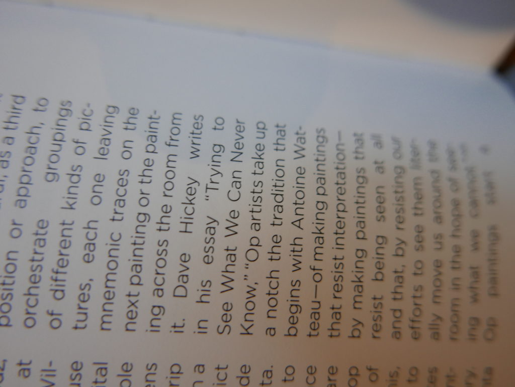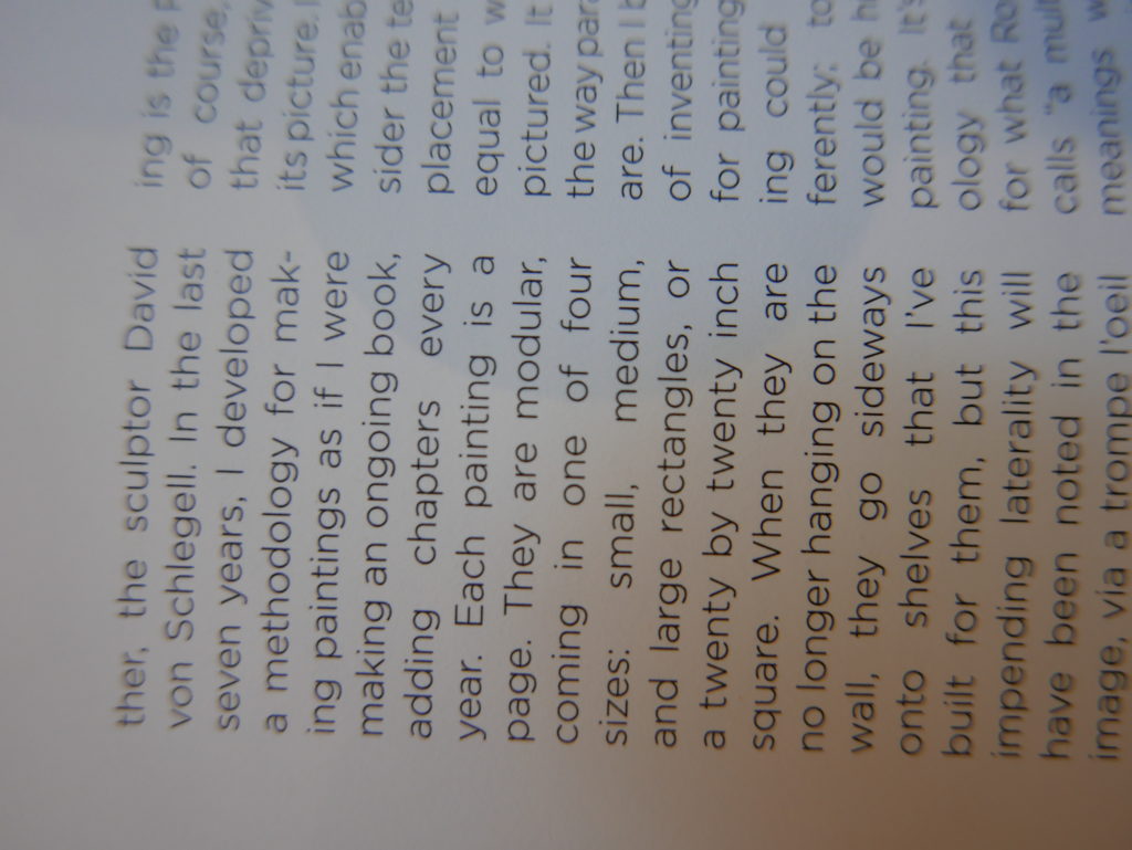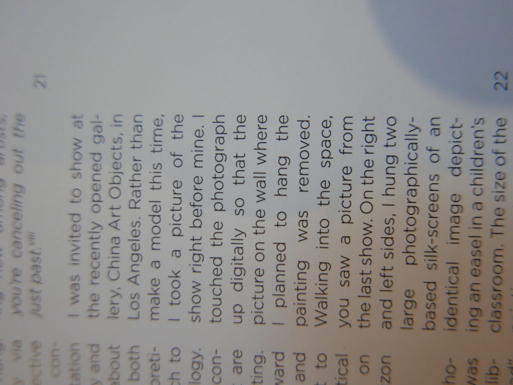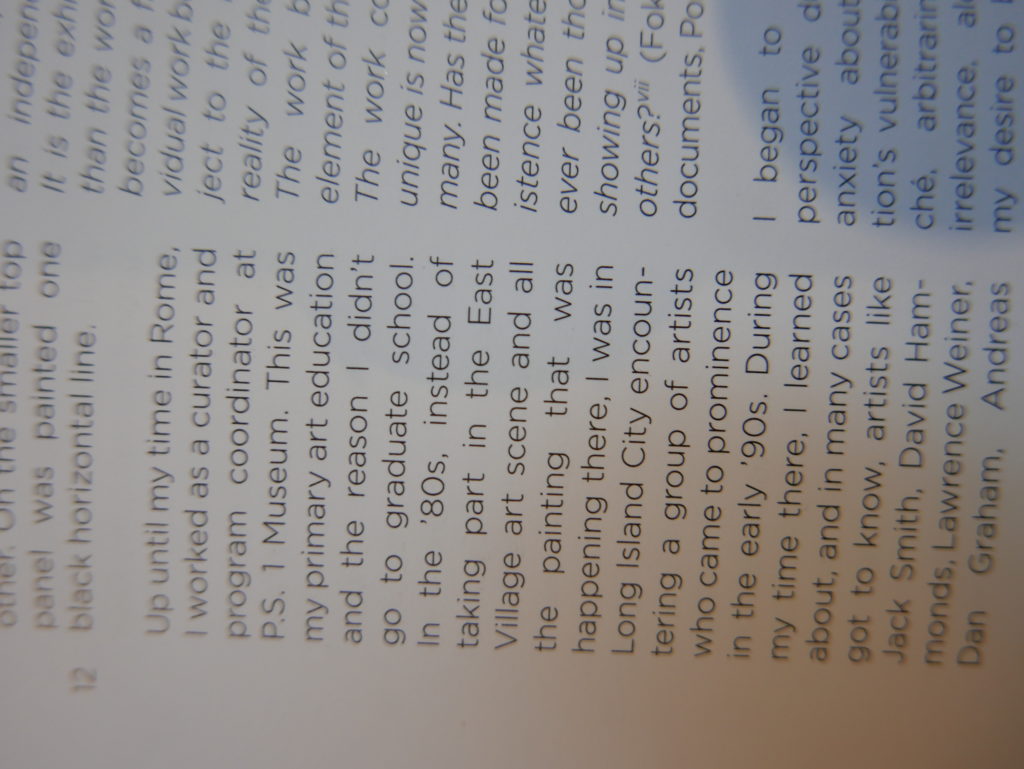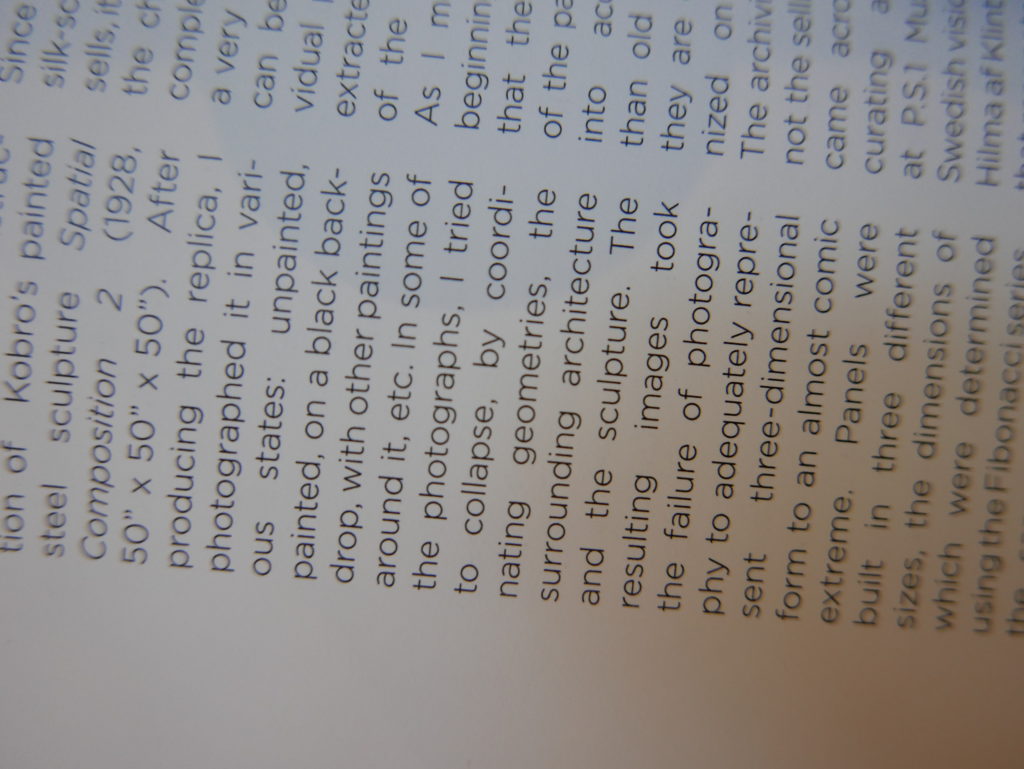 The only way I could get my hands on R. H. Quaytman’s early book-work Allegorical Decoys was by the circuitous route of Ohio State Libraries’ Interlibrary Loan system. When it finally arrived this morning, I discovered that I was not able to check the book out of the library and so I had to read it there and then on the spot. Knowing that I would want to return to the opening essay, I decided to take a series of snapshots of overlapping sections of the text. There are many things to say about this text, but I was especially drawn to Quaytman’s description of her time at the American Academy in Rome. It was there that she initiated her series of works as chapters as a response to what she describes as ‘painting’s status as an isolated target of a monocular and disembodied eye’. She continues to unpack this metaphor by evoking the monstrous figure of the Cyclops: ‘What mechanisms are at work in painting that assume an audience of one male monogamous Cyclops who will never leave?’. In the spirit of Quaytman’s attack on Cyclopean forms, here is a slide show of my multi-perspective photographs of her essay.