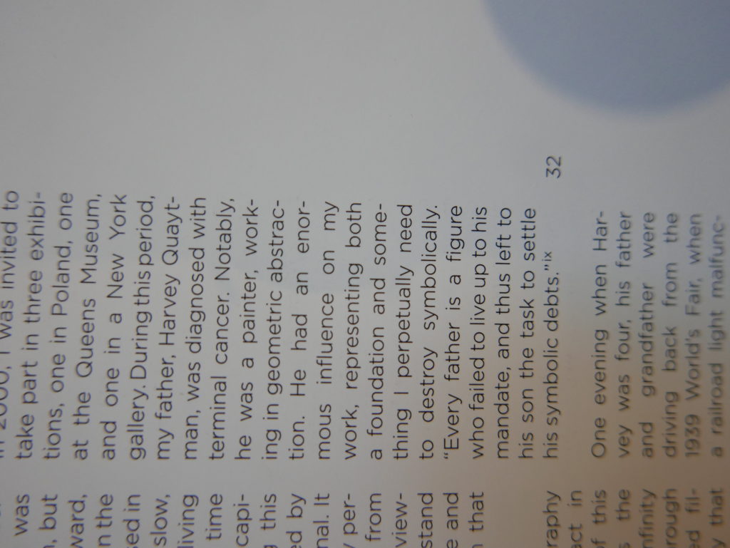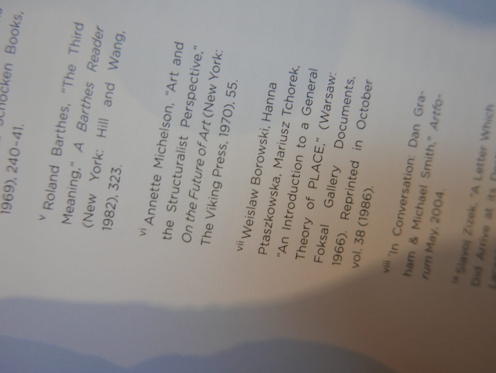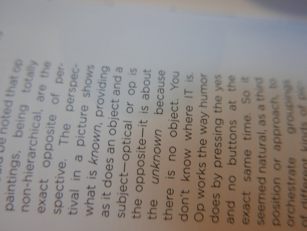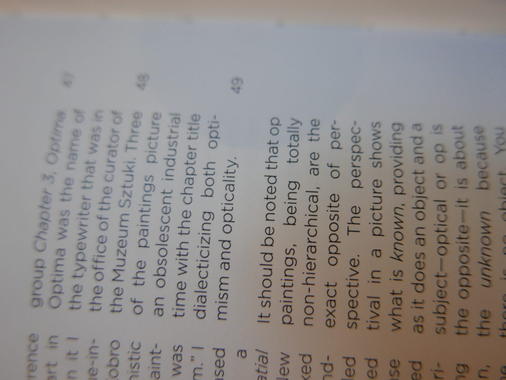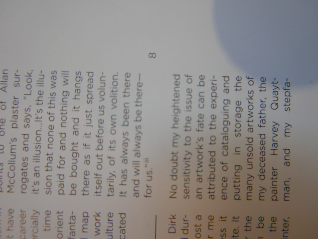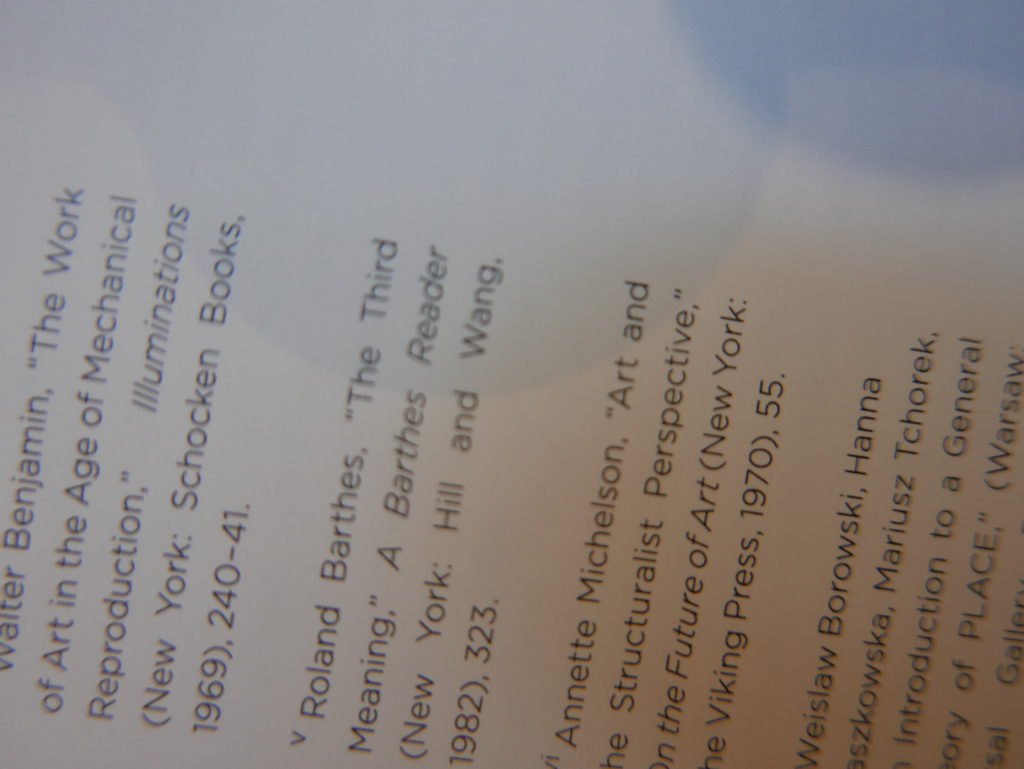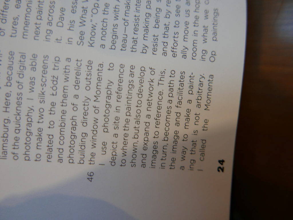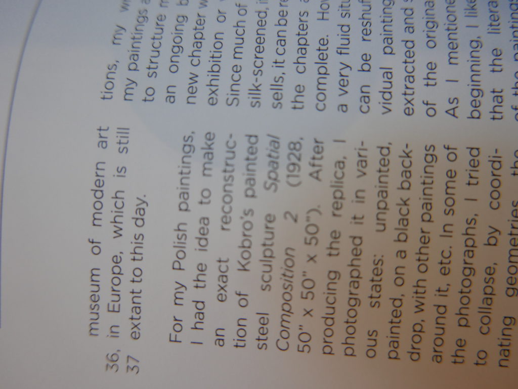 The only way I could get my hands on R. H. Quaytman’s early book-work Allegorical Decoys was by the circuitous route of Ohio State Libraries’ Interlibrary Loan system. When it finally arrived this morning, I discovered that I was not able to check the book out of the library and so I had to read it there and then on the spot. Knowing that I would want to return to the opening essay, I decided to take a series of snapshots of overlapping sections of the text. There are many things to say about this text, but I was especially drawn to Quaytman’s description of her time at the American Academy in Rome. It was there that she initiated her series of works as chapters as a response to what she describes as ‘painting’s status as an isolated target of a monocular and disembodied eye’. She continues to unpack this metaphor by evoking the monstrous figure of the Cyclops: ‘What mechanisms are at work in painting that assume an audience of one male monogamous Cyclops who will never leave?’. In the spirit of Quaytman’s attack on Cyclopean forms, here is a slide show of my multi-perspective photographs of her essay.