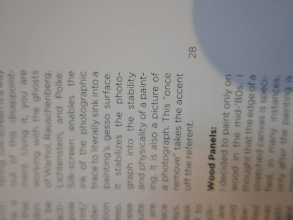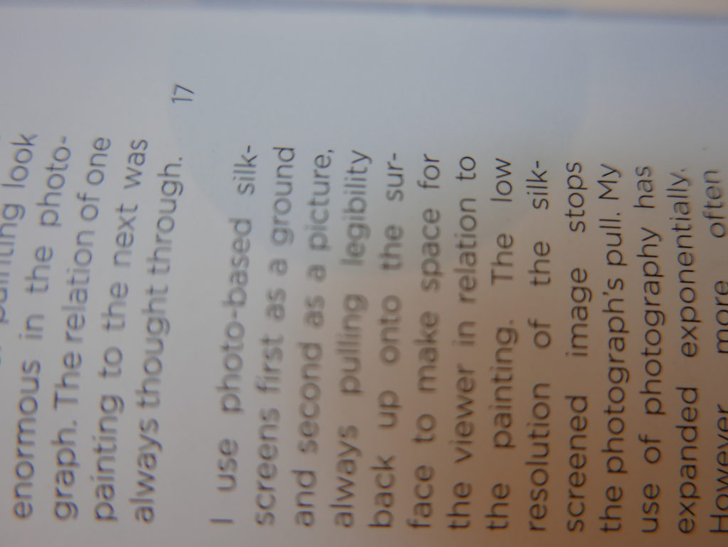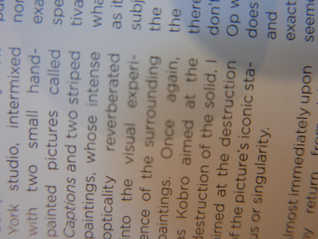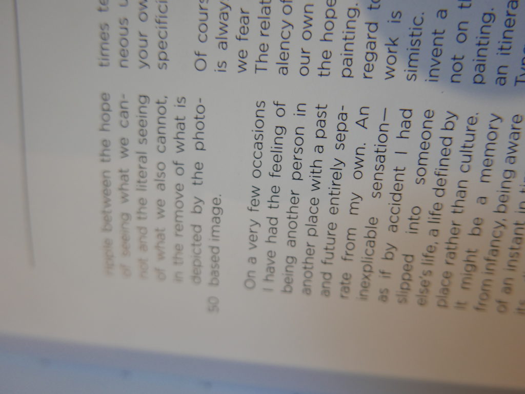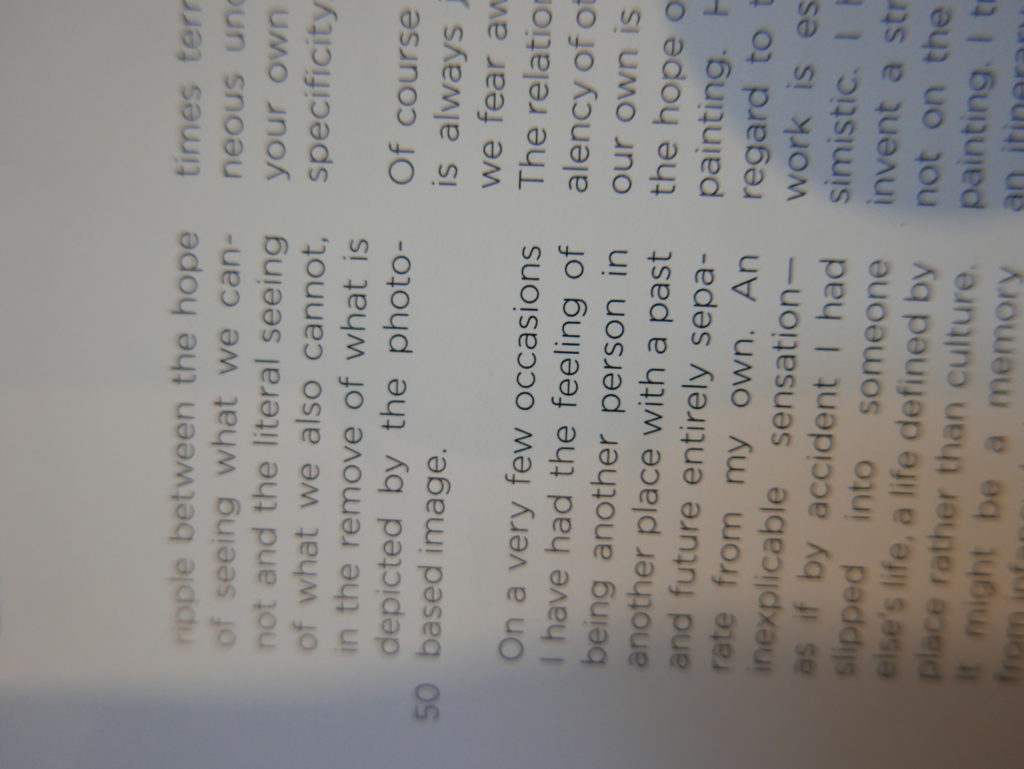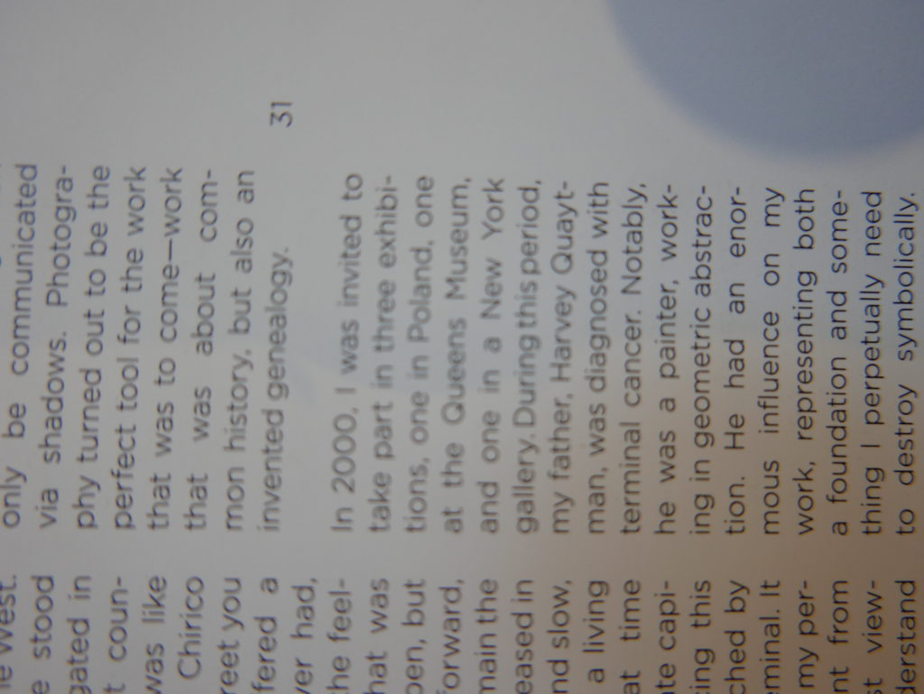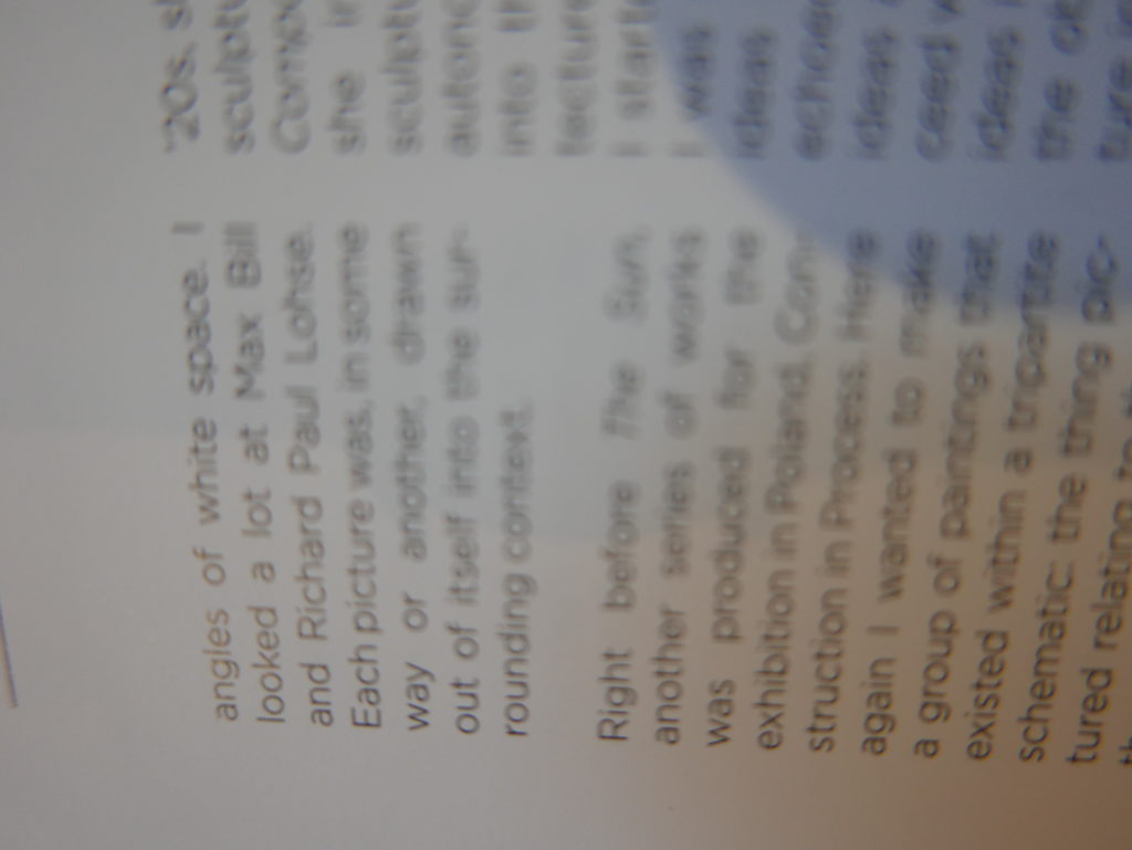 The only way I could get my hands on R. H. Quaytman’s early book-work Allegorical Decoys was by the circuitous route of Ohio State Libraries’ Interlibrary Loan system. When it finally arrived this morning, I discovered that I was not able to check the book out of the library and so I had to read it there and then on the spot. Knowing that I would want to return to the opening essay, I decided to take a series of snapshots of overlapping sections of the text. There are many things to say about this text, but I was especially drawn to Quaytman’s description of her time at the American Academy in Rome. It was there that she initiated her series of works as chapters as a response to what she describes as ‘painting’s status as an isolated target of a monocular and disembodied eye’. She continues to unpack this metaphor by evoking the monstrous figure of the Cyclops: ‘What mechanisms are at work in painting that assume an audience of one male monogamous Cyclops who will never leave?’. In the spirit of Quaytman’s attack on Cyclopean forms, here is a slide show of my multi-perspective photographs of her essay.
