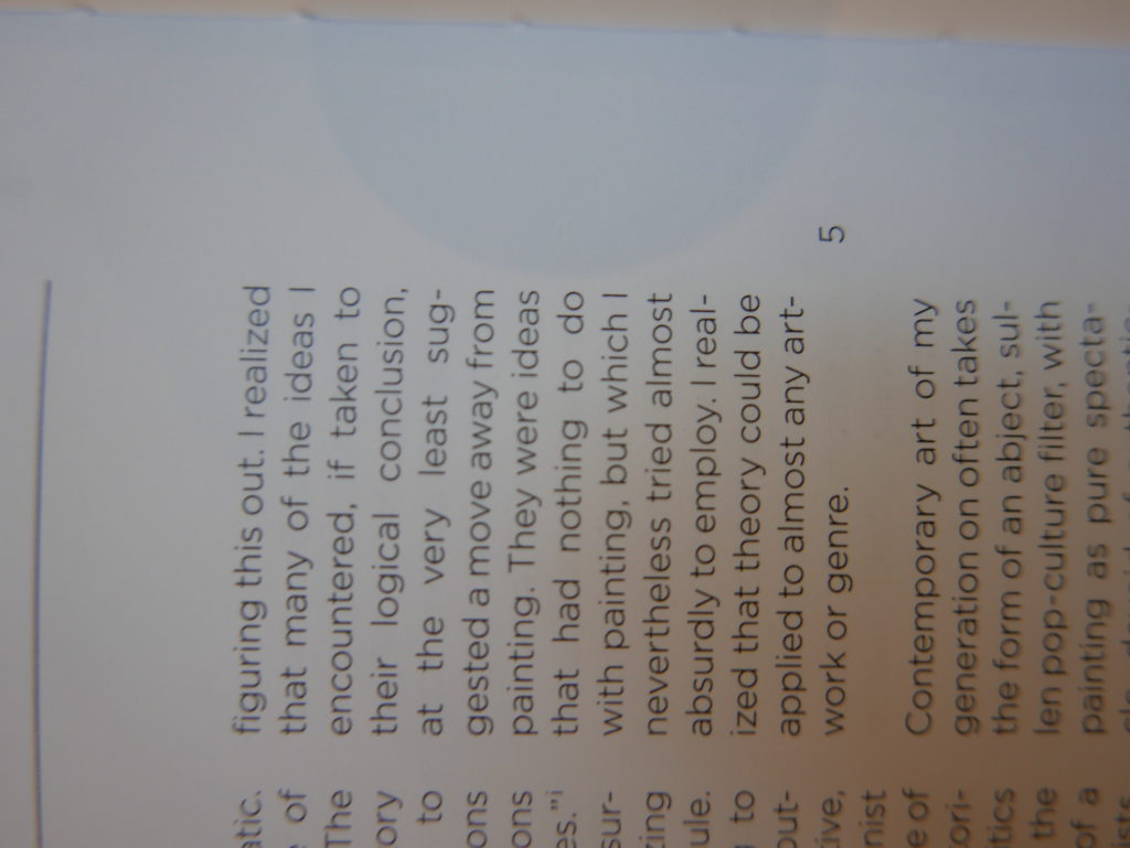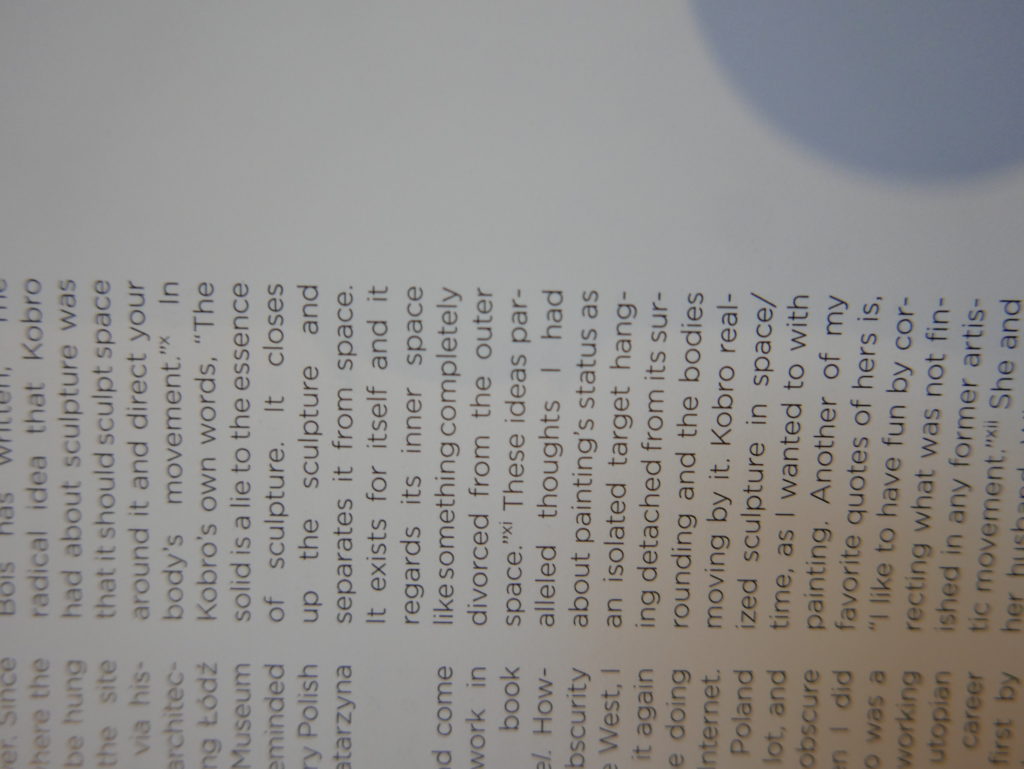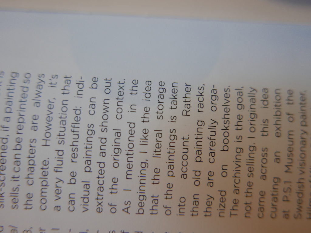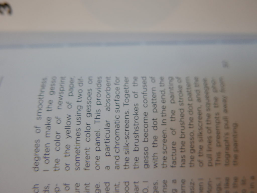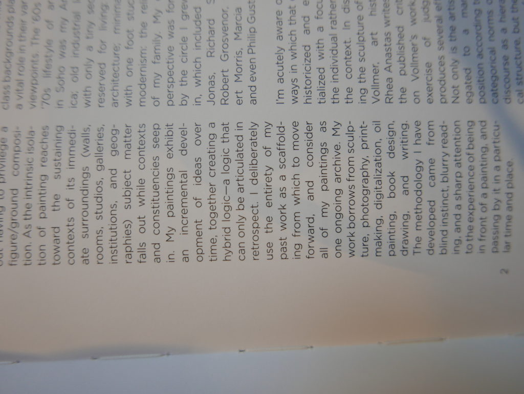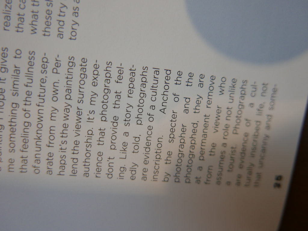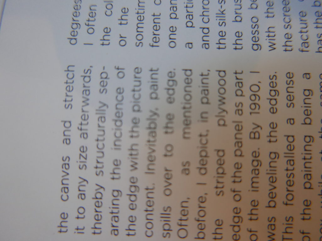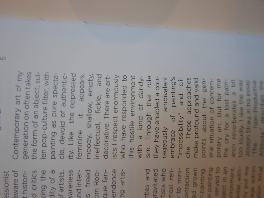 The only way I could get my hands on R. H. Quaytman’s early book-work Allegorical Decoys was by the circuitous route of Ohio State Libraries’ Interlibrary Loan system. When it finally arrived this morning, I discovered that I was not able to check the book out of the library and so I had to read it there and then on the spot. Knowing that I would want to return to the opening essay, I decided to take a series of snapshots of overlapping sections of the text. There are many things to say about this text, but I was especially drawn to Quaytman’s description of her time at the American Academy in Rome. It was there that she initiated her series of works as chapters as a response to what she describes as ‘painting’s status as an isolated target of a monocular and disembodied eye’. She continues to unpack this metaphor by evoking the monstrous figure of the Cyclops: ‘What mechanisms are at work in painting that assume an audience of one male monogamous Cyclops who will never leave?’. In the spirit of Quaytman’s attack on Cyclopean forms, here is a slide show of my multi-perspective photographs of her essay.