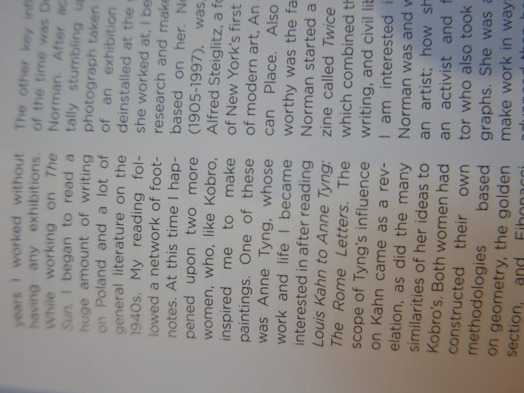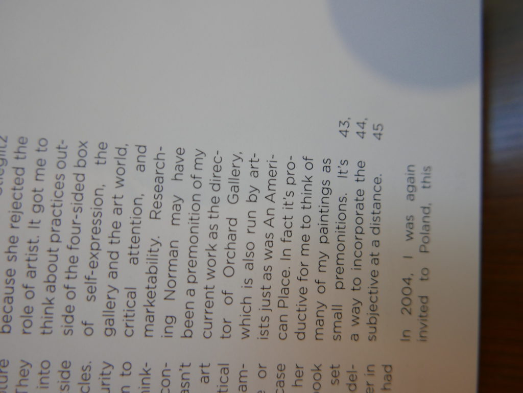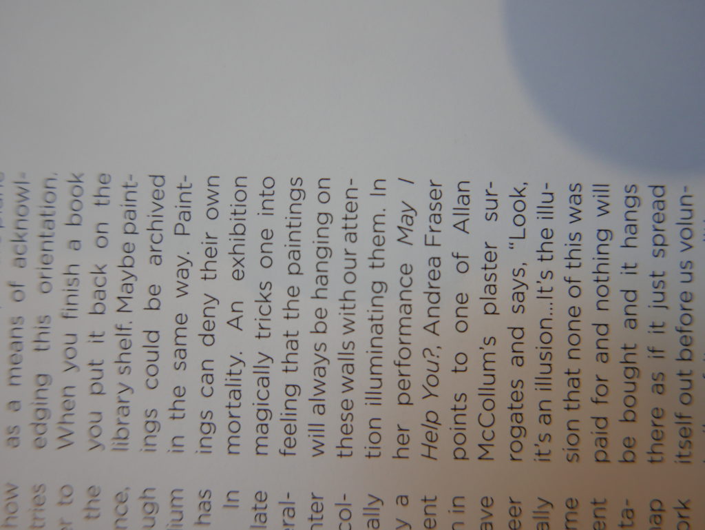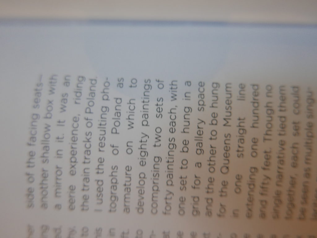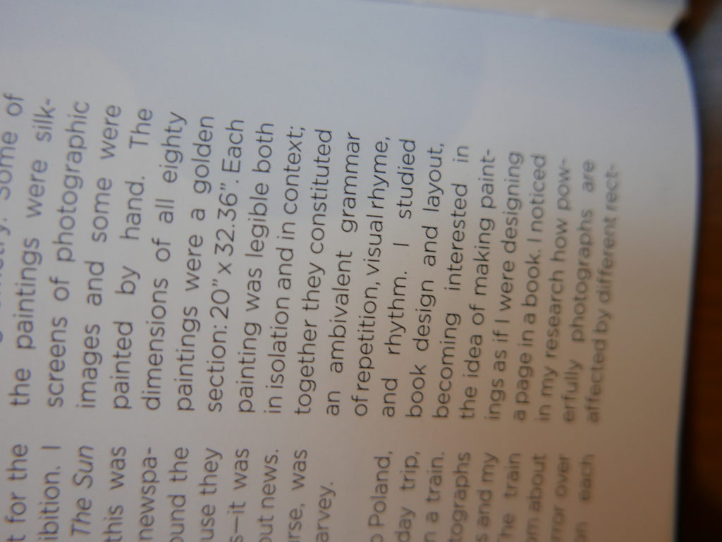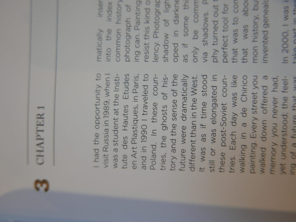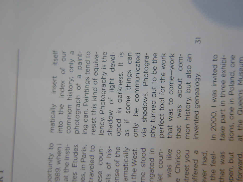 The only way I could get my hands on R. H. Quaytman’s early book-work Allegorical Decoys was by the circuitous route of Ohio State Libraries’ Interlibrary Loan system. When it finally arrived this morning, I discovered that I was not able to check the book out of the library and so I had to read it there and then on the spot. Knowing that I would want to return to the opening essay, I decided to take a series of snapshots of overlapping sections of the text. There are many things to say about this text, but I was especially drawn to Quaytman’s description of her time at the American Academy in Rome. It was there that she initiated her series of works as chapters as a response to what she describes as ‘painting’s status as an isolated target of a monocular and disembodied eye’. She continues to unpack this metaphor by evoking the monstrous figure of the Cyclops: ‘What mechanisms are at work in painting that assume an audience of one male monogamous Cyclops who will never leave?’. In the spirit of Quaytman’s attack on Cyclopean forms, here is a slide show of my multi-perspective photographs of her essay.