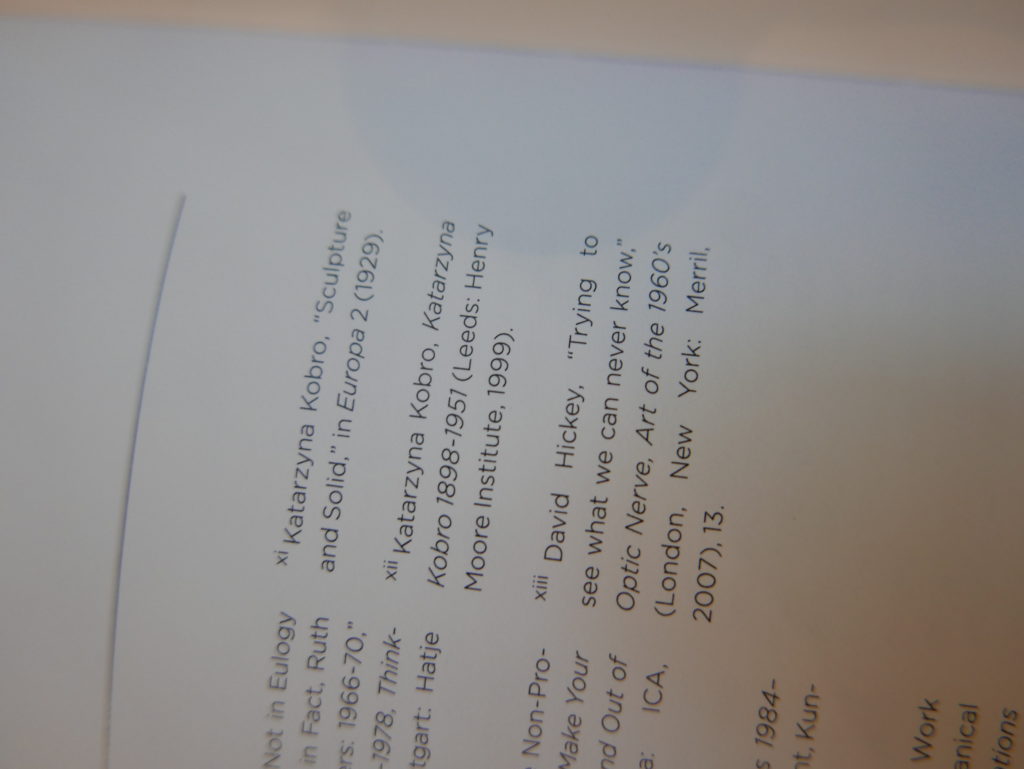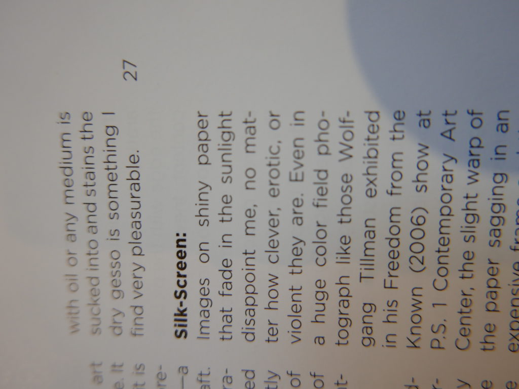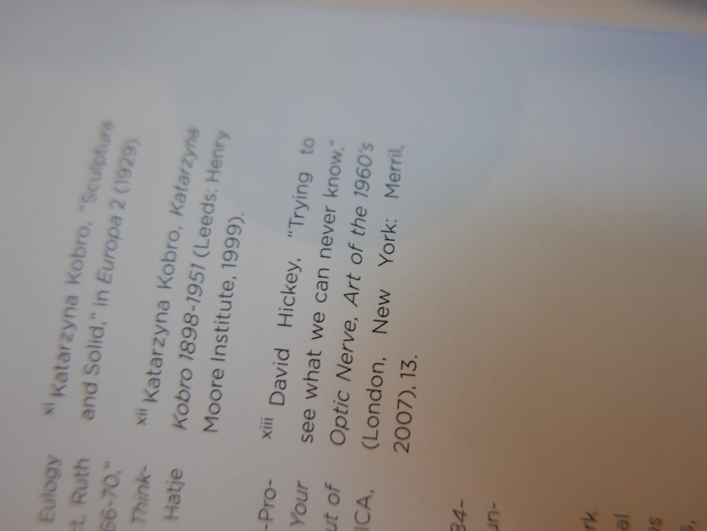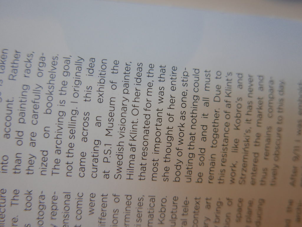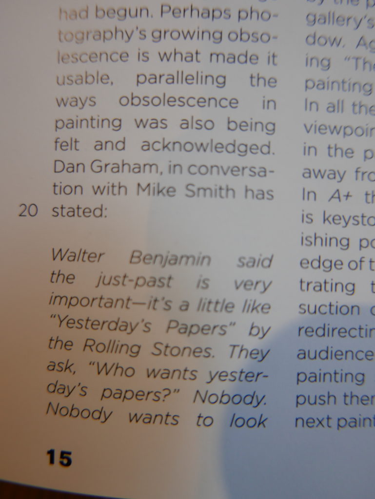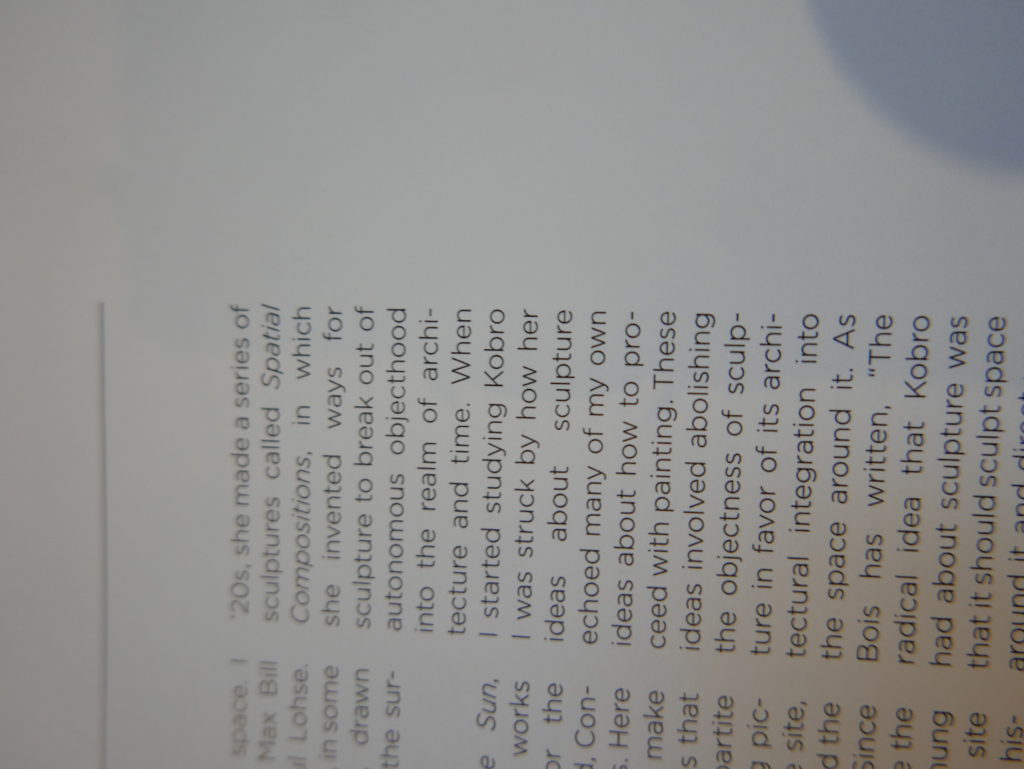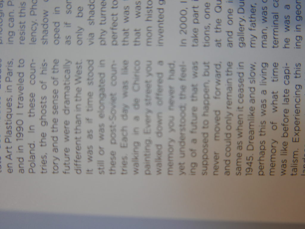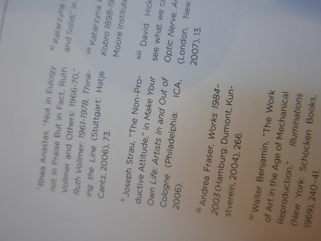 The only way I could get my hands on R. H. Quaytman’s early book-work Allegorical Decoys was by the circuitous route of Ohio State Libraries’ Interlibrary Loan system. When it finally arrived this morning, I discovered that I was not able to check the book out of the library and so I had to read it there and then on the spot. Knowing that I would want to return to the opening essay, I decided to take a series of snapshots of overlapping sections of the text. There are many things to say about this text, but I was especially drawn to Quaytman’s description of her time at the American Academy in Rome. It was there that she initiated her series of works as chapters as a response to what she describes as ‘painting’s status as an isolated target of a monocular and disembodied eye’. She continues to unpack this metaphor by evoking the monstrous figure of the Cyclops: ‘What mechanisms are at work in painting that assume an audience of one male monogamous Cyclops who will never leave?’. In the spirit of Quaytman’s attack on Cyclopean forms, here is a slide show of my multi-perspective photographs of her essay.