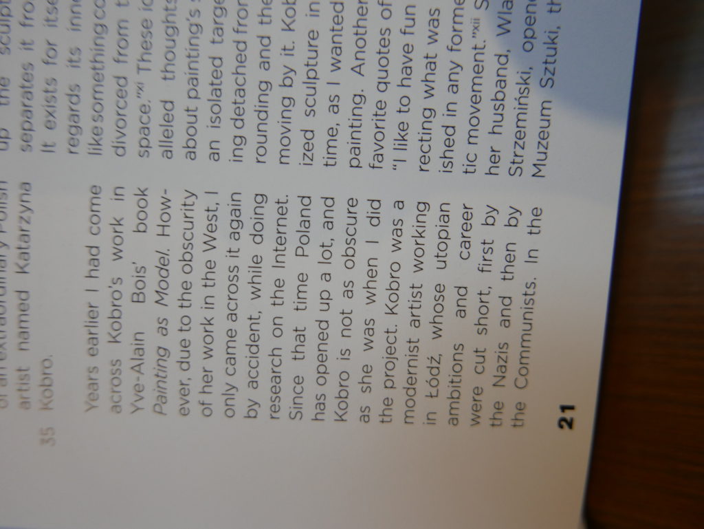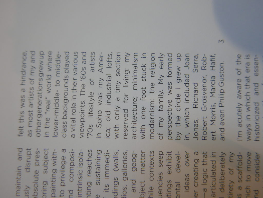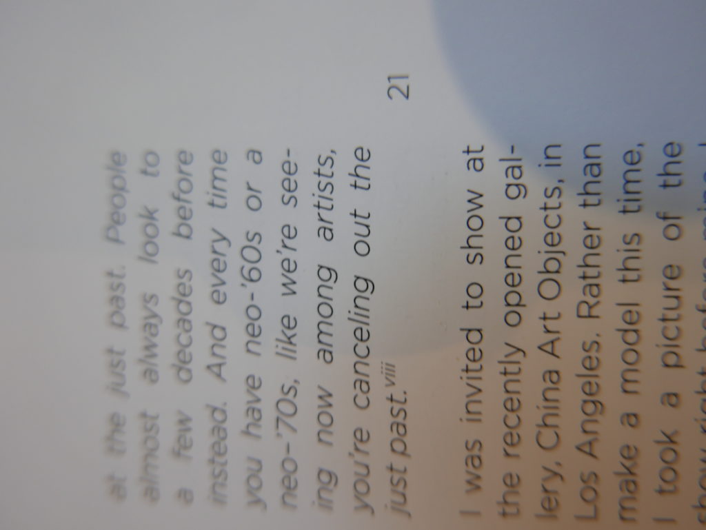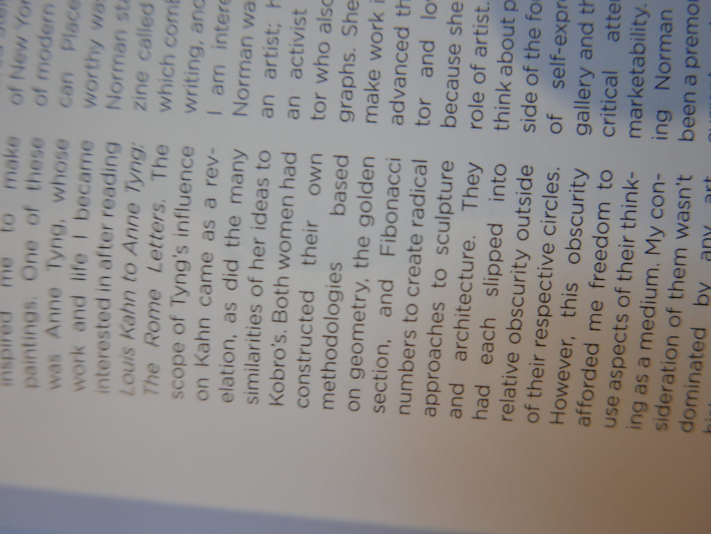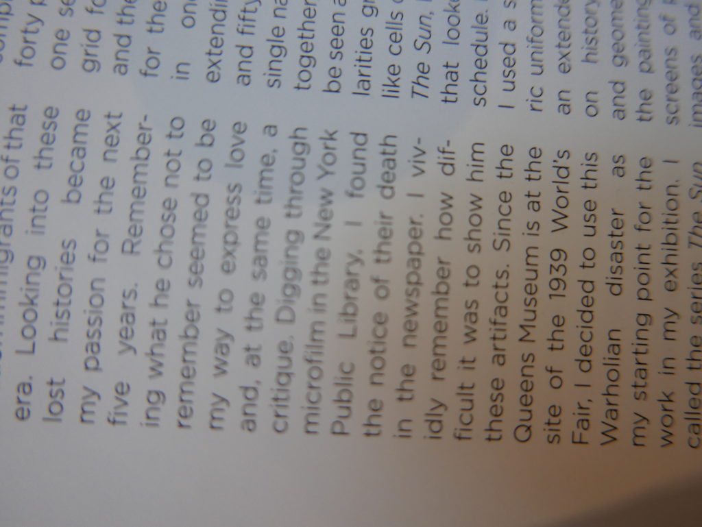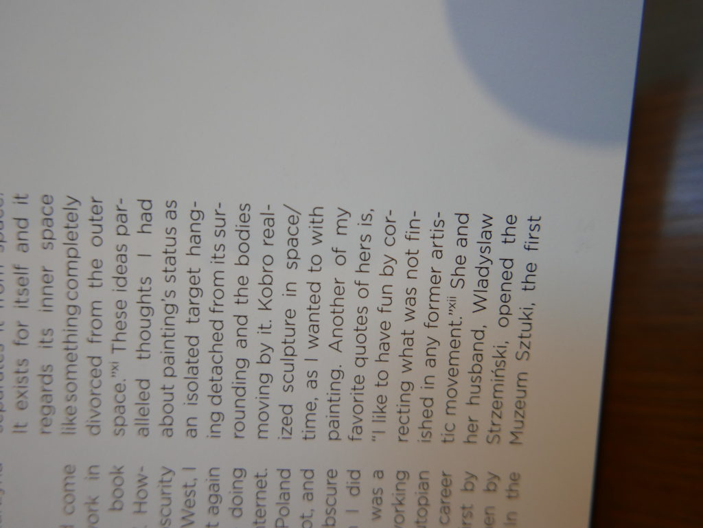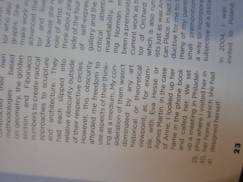 The only way I could get my hands on R. H. Quaytman’s early book-work Allegorical Decoys was by the circuitous route of Ohio State Libraries’ Interlibrary Loan system. When it finally arrived this morning, I discovered that I was not able to check the book out of the library and so I had to read it there and then on the spot. Knowing that I would want to return to the opening essay, I decided to take a series of snapshots of overlapping sections of the text. There are many things to say about this text, but I was especially drawn to Quaytman’s description of her time at the American Academy in Rome. It was there that she initiated her series of works as chapters as a response to what she describes as ‘painting’s status as an isolated target of a monocular and disembodied eye’. She continues to unpack this metaphor by evoking the monstrous figure of the Cyclops: ‘What mechanisms are at work in painting that assume an audience of one male monogamous Cyclops who will never leave?’. In the spirit of Quaytman’s attack on Cyclopean forms, here is a slide show of my multi-perspective photographs of her essay.