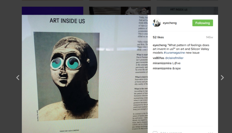 Flicking through artist Ian Cheng’s book Live Simulations, I came across the following description of his 2014 work Metis Suns: Pichaku [sic?] looked into her eyes and instantly understood her every molecule. But it wasn’t any special ability on his part: he was 85% idiot with humans. It was hers. She precisely caricatured her face, her … Continue reading Cartoons familiar and ancient: Looking into the Eyes of Ian Cheng’s Metis Suns