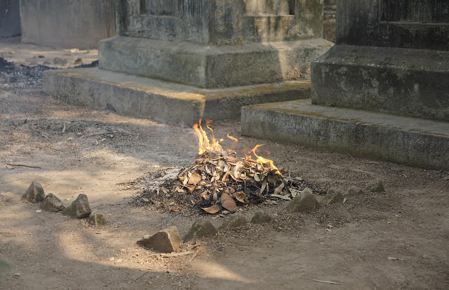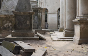 A group of visitors to the city, we meet up with our hired guide and walk west on South Park Street as the guide volubly narrates the history of its colonial-era department stores, cafés, banks, and bookstores. This is a preamble; the real destination is the South Park Street Cemetery, a truly haunted site of magnificent, crumbling tombs, and the final resting place of nineteenth-century British colonials. The monuments are extravagant structures in the style of Greek temples and other ruins; the largest and tallest memorial being a replica of an Egyptian pyramid. Surrounded by palm fronds, and appearing to emerge from a cloud of thick smoke, the tombs remind me of the jungle scenes in Apocalypse Now. The smoke is generated by the many small fires that dot the cemetery and lend it its distinctive smell of burning eucalyptus. Our guide is eager to point out the graves of women who died young and who were beautiful, but I’ve stopped listening and wander off on my own, taking in the sepulchral landscape, my eyes focused on the small screen of my camera set to “record.”