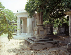 Once I was back in New York, Nandita wrote to me that she was headed to Kolkata after a stay in Laos, where Shrinkhla had been volunteering at a pediatric clinic. I asked if she might go to the cemetery and try to locate Thomas Prinsep’s grave (Thomas, one of possibly eleven “Anglo-Indian” siblings, was the brother of Thoby, who married Cameron’s sister, Sara). Nandita easily located the monument and sent a digital photo, offering to go back with a medium format camera. The idea came to me that Nandita should put herself in the photo, à la Francesca Woodman. She said she never photographed herself and liked the idea of stepping outside her comfort zone. She went back with Shrinkhla to operate the bulky camera, a Mamiya 6 × 7, but managed to grab just a few photos before she was stopped by a custodian and told: “Only cell phone pictures allowed!”