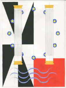 This anachronism also takes on a political bent when we see two columns, one with the stars of the European Union flag behind them and another with a painting of the myth of the Rape of Europa (a symbol of European unity used on the first Euro coin).