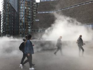 Celphalus: Sure, why not. Oh, there was something else that struck me. I felt like the exhibition mirrored the development of the Tate Modern as a building and space. The changing walls, the changing of interior space and knowing the Tanks are beneath and the new building is alongside. It seems the artist was making this direct connection. When I went to the exhibition of Elton John’s collection of photographs in the new wing – some of which were very small – there was something less cluttered about the space than the old Tate Modern. Perhaps the Parreno made me think about this. It mirrored an exhibition space – the re-configuring of a gallery space for a temporary exhibition – and almost mirrored the development of the Tate as an exhibition space. Also, outside, between the junction of the old and new building, at an acute angle, they have a seating area and a large space that activates steam as opposed to water jets from the floor – all of a sudden the whole area is covered in mist.