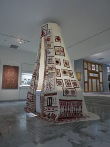But it wasn’t merely the route that I had taken and the poverty that I had witnessed that primed me for Hiwa K’s work at the Benaki, it was an encounter with an artwork and a person at another branch of the museum: the Museum of Islamic Art. As I stood transfixed by Mounira Al Solh’s Sperveri (2017) – an embroidered tent and bed with testimonies and visual imagery from letters written by recent refugees to both Athens and Kassel from war-torn Middle Eastern countries such as Syria and Iraq – the documenta 14 guard/representative at the museum asked me if I wanted to discuss the work. [I am still having technical issues with uploading photos, but somehow I managed the most important one!]