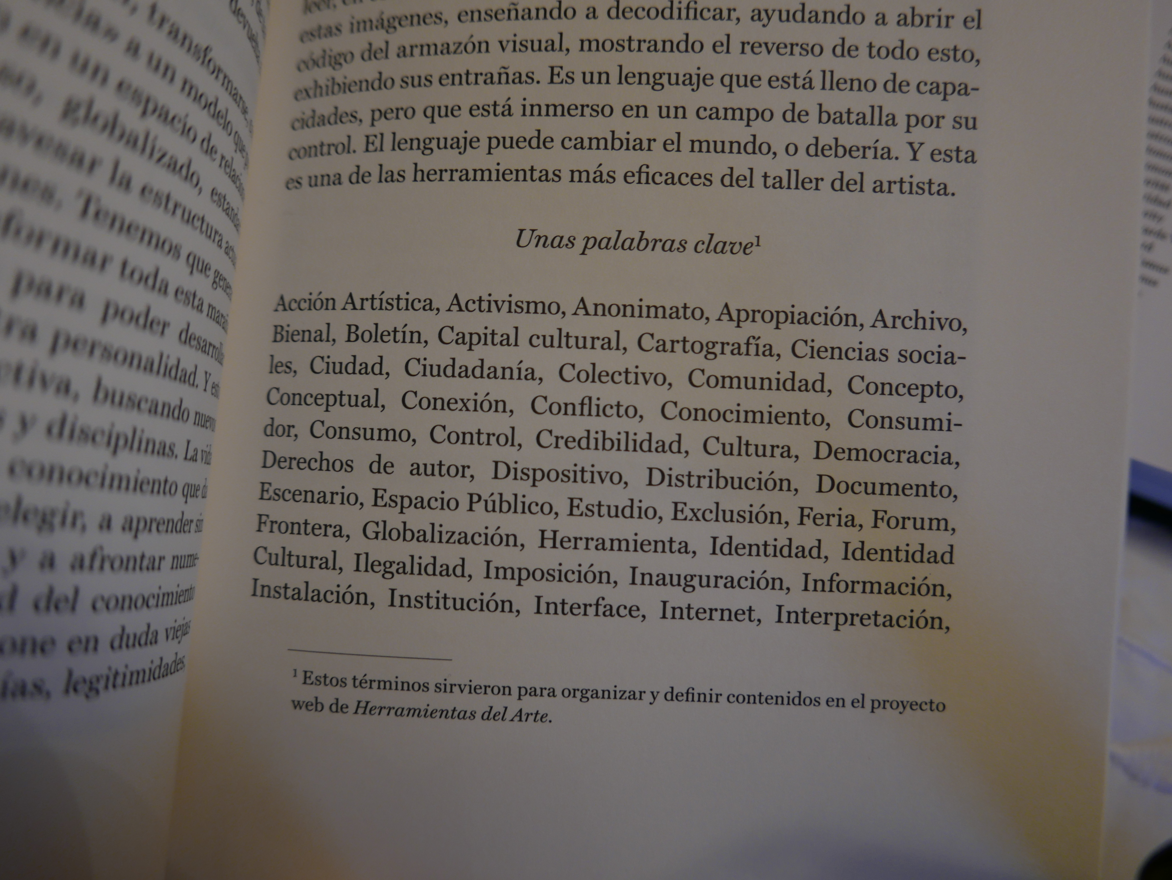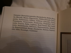 In a note on this essay, I found out that the source of these keywords came from the book El arte en cuestiónso that is why I hunted down this book. Here are those keywords from Medina’s essay: