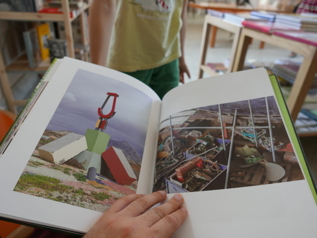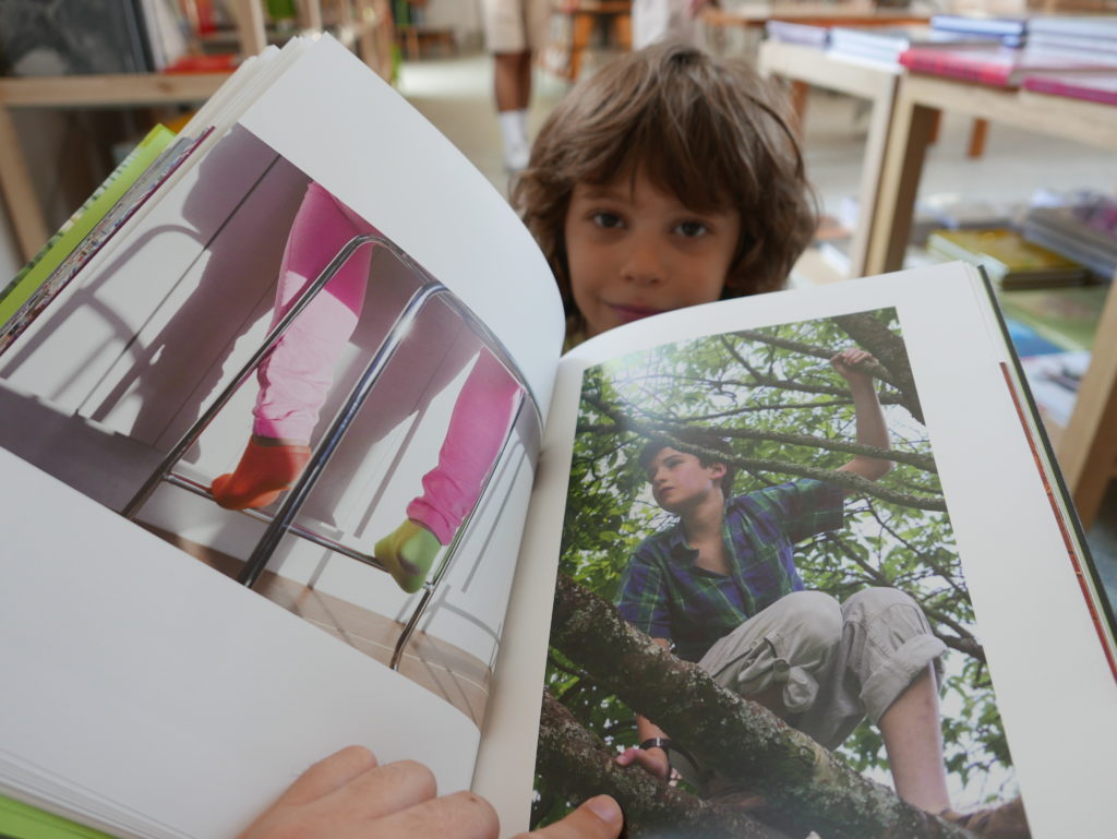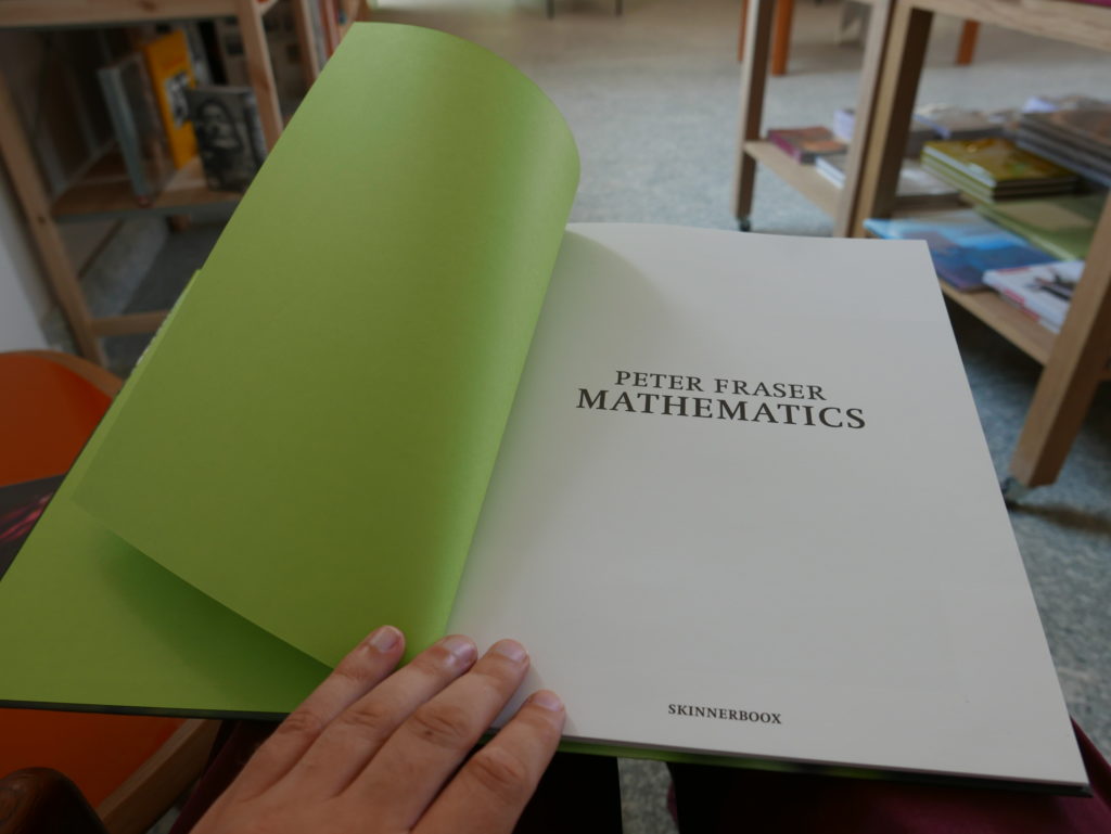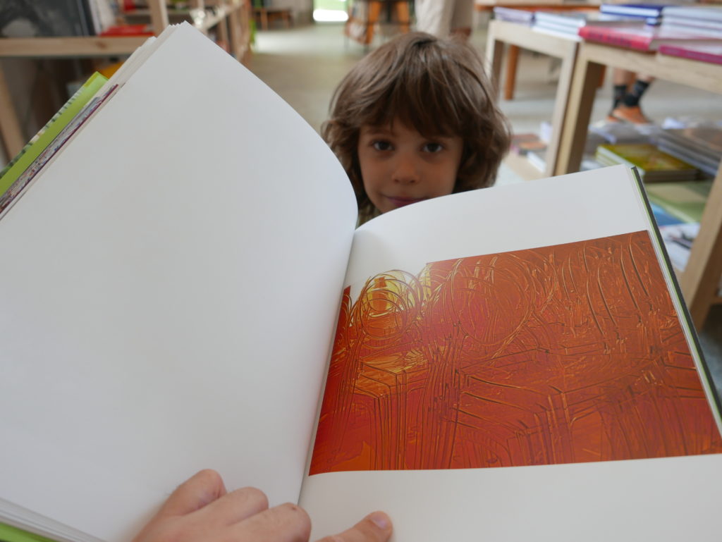 Then while leafing through the book Mathematics in the pop-up bookstore, I again invited Eneko to intervene, this time in a series of photos I took of each page of the book (knowing I was going to post about the exhibition today), as he and Rebeka impatiently waited for me to finish, so we could go and explore more of the gardens (waiting for me and my blog has been one of the main features of our trip so far…)