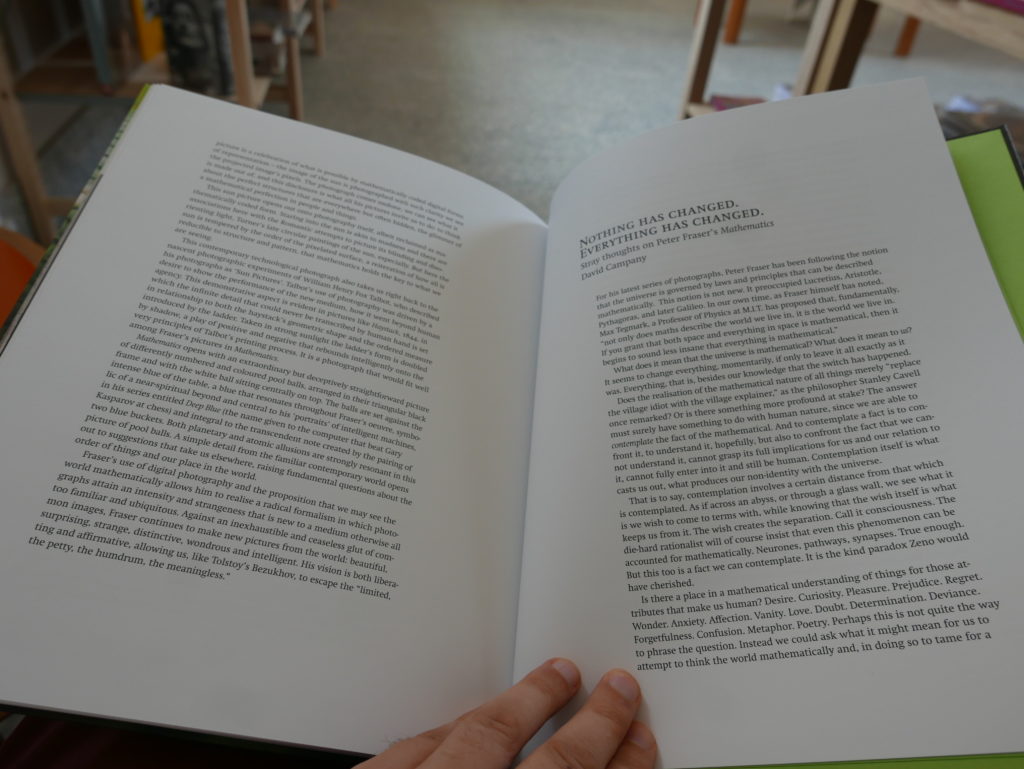 “Forty-two” is the response given by Deep Thought, the supercomputer programmed to calculate the answer to the Ultimate Question of Life, the Universe, and Everything in Douglas Adams’ Hitchhiker’s Guide to the Galaxy. This answer, while delivered after centuries of waiting and couched within some serious expectation management (‘You’re really not going to like it’), has been used as the basis for the argument in Max Tegmark’s 2014 book Our Mathematical Universe, which in turn influenced the series Mathematics by Welsh photographer Peter Fraser. I saw a recent manifestation of Fraser’s Mathematics yesterday, fittingly curated by David Campany in the Real Jardín Botánico here in Madrid as part of PHotoEspaña 17. Walking around the beautiful gardens and photography exhibitions (Elliott Erwitt’s Cuba also installed in the Real Jardín Botánico), was a pleasant distraction from the waiting, without much hope, for Trump’s announcement to withdraw from the Paris Climate Agreement. For some reason, while visiting Mathematics I asked my son, Eneko, to mimic the pose of a boy in one of Fraser’s photographs. (Actually it was Eneko who recognized that he looked like the boy in the photo).