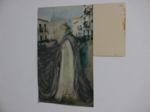 You took this and other photographs of Andreas Ragnar Kassapis’ paintings in the Odeion on your first night in Athens. You were not sure why you took them. You took other photographs on other nights, but you lost those photographs when you were trying to clear memory space on your computer and mistakenly deleted them. This means that you only remember the objects painted in the photographs that you have not lost and that you can still look at. For example, you can look at the photograph of a text, which you remember was positioned between painted objects (you now only have one photograph of a telephone, although there may have been other telephones). So you can still know how the text begins: nuance is an overtone of memory/it is part of a mnemonic trace/it can be traced inside images. This photograph is of a painting that I don’t understand in any way. You can make out some kind of figure in a street scene, but that is all. You could imagine that it is a painting of Mnemosyne herself. If it is not her, do you think it looks more like an object or a text or something in between?