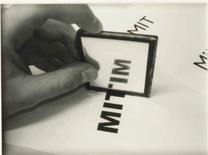 While Zittel turns to Lorem ipsum to reflect on the tension between structure and meaning at a general level, transforming a whole text into this Latin placeholder, Ryan Gander’s A Future Lorem Ipsum, 2006, examines this tension at the level of the single word. The work is a black and white photograph depicting someone with a mirror attempting to show how an invented word Mitim is a physical palindrome. The word is MITIM and is an acronym for The Man with the Iron Mask. At the same time, this word/acronym could also be the mirroring of the word MIT, whereby Gander replaces the manipulated Latin of Lorem ipsum with the German word.