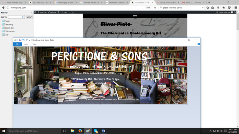 Minus Plato invites you to: Perictione & Sons a minus plato office hours exhibition August 24th to December 9th Thursday 12pm to 2pm or by appointment 328 University Hall A growing installation of books and display of altered books (by OSU BFA and MFA Students), accompanied by a series of displaced meetings, conversations and readings … Continue reading Perictione & Sons: A Minus Plato Office Hours Exhibition