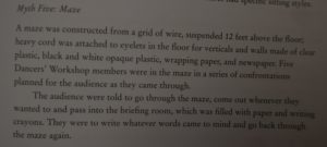 In the classroom you have constructed a maze from a grid of wire, suspended 12 feet above the floor; heavy cord is attached to eyelets in the floor for verticals and walls made of clear plastic, black and white opaque plastic, wrapping paper, and newspaper.