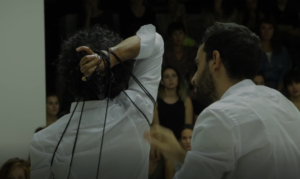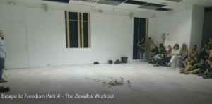 For today’s session of Freedom Park Fridays, we will be doing a collective workout following the directions of Peruvian artist Sergio Zevallos and his performance Educación cívica/Civic Education. You will need to find yourself a partner and a large room. Now, take a deep breath and get ready for the workout.