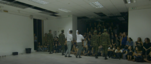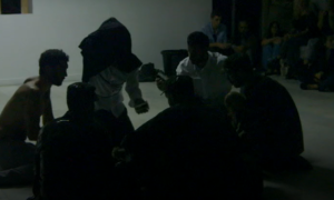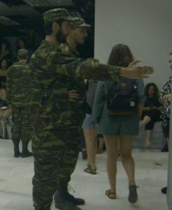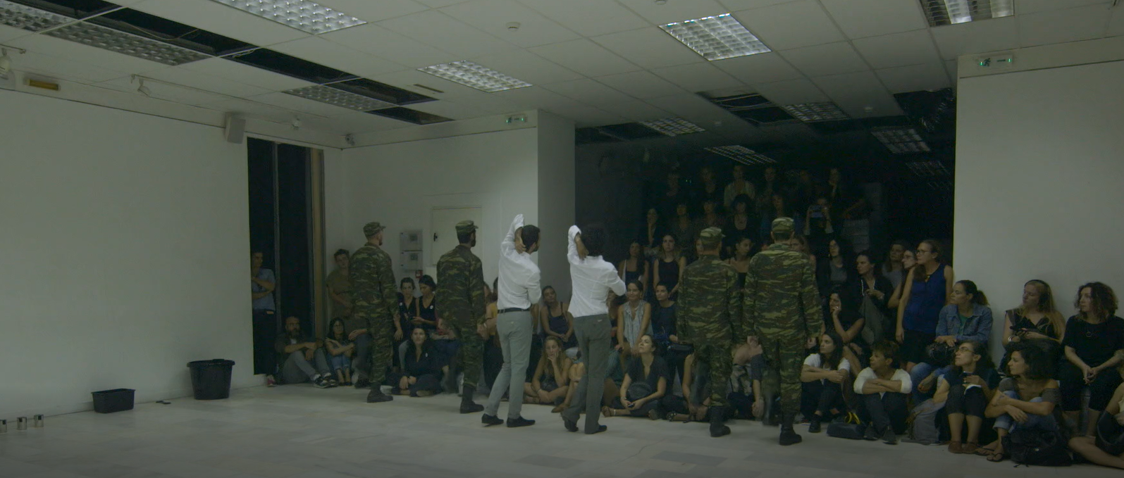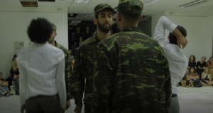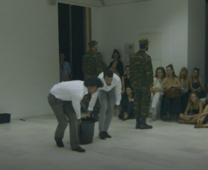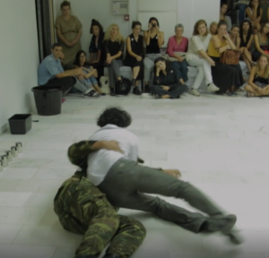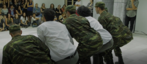 19. In the performance you see two men wrestling on the floor, one in a white shirt and the other in soldier’s attire