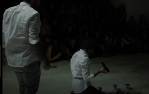 21. In the imaginary performance, in your mind’s eye, you see one of the men in white shirts cut open the clothes of one of the others in soldier’s attire