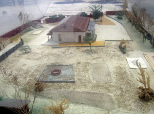 5. “This way, please.” Matta walks Diana over to the small model of the torture camp to help her visualize the architectural arrangement of a place now gone: Cuartel Terranova. The word terranova (new land) once designated unexplored territories on ancient maps, and indeed this site remains unexplored. Who knew the Chilean military was interested in historical scholarship? The mock-up of the site is laid out like a coffin under plastic, a slightly opaque sunshade that in itself distorts vision. As in many historically important sites, the model offers a bird’s-eye view of the entire area. The difference here is that what Diana sees in the model is no longer there in actuality. Even though she is present, she will not experience it “in person.” So, one might ask, what is the purpose of the visit? What can Diana understand by being physically in a torture center once the indicators have disappeared? Little beside the sign at the entrance reveals any context. Diana’s photographs might illustrate what this place is now, not what it was. So, why come here? It’s enough for now that she is here in person with Matta, who has volunteered to take her through the recorrido (walk-through). Matta speaks in Spanish; it makes a difference. He seems to relax a little, though his voice is very strained and he clears his throat often. Maybe the words resist being conjured up. Maybe his stiff body belies current attempts to put the “past” behind him. For Matta, it is not just about “what happened” in the historical sense, but also about the ways in which his experience at Villa Grimaldi carries into the present.