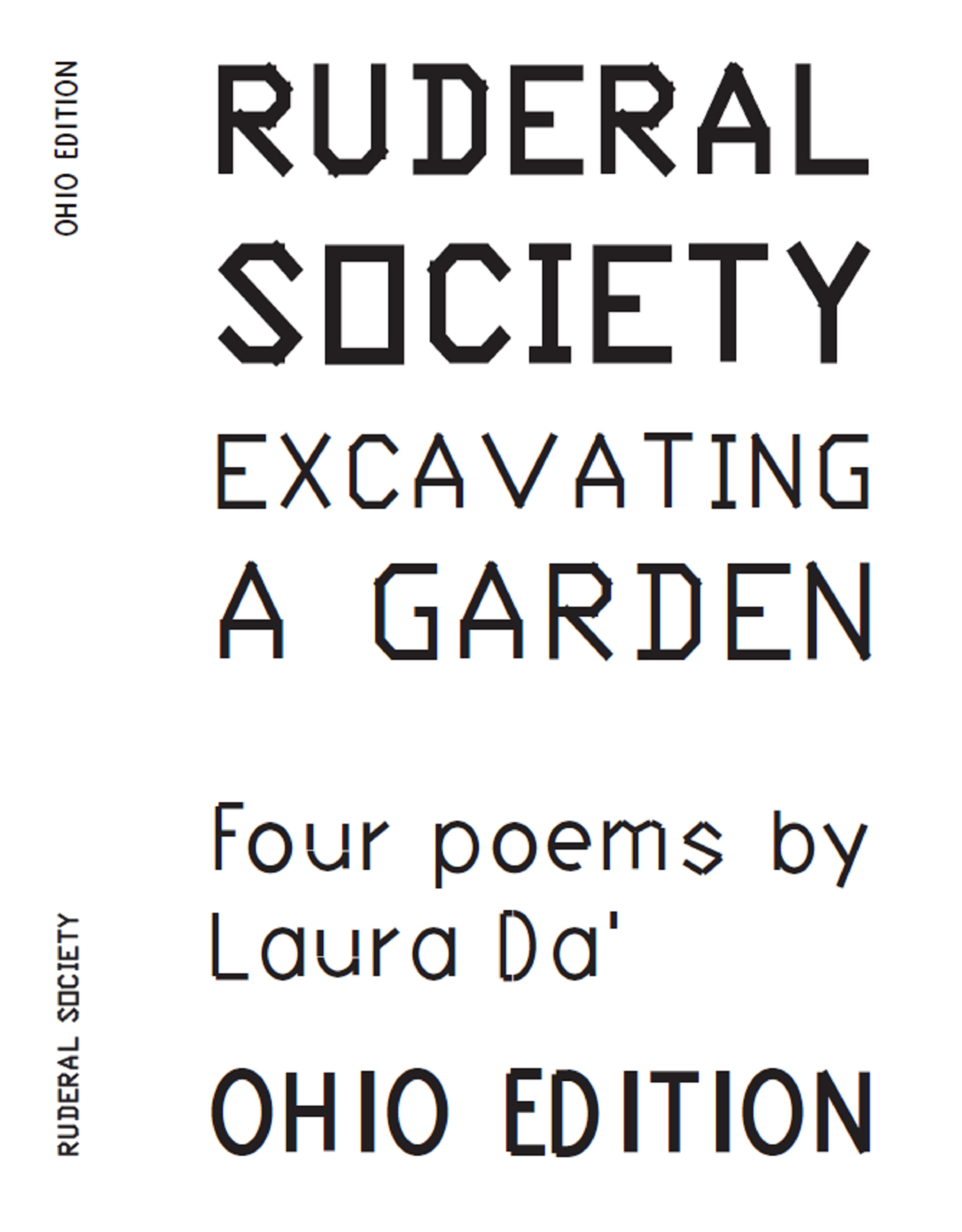 Poem by Laura Da’ from her collection Severalty (2025, University of Arizona Press) in the book Ruderal Society: Excavating a Garden. Four Poems by Laura Da’. Ohio Version (2025), designed by VIER5, and published on occasion of the exhibition Why Lazarus at the Urban Arts Space, Lazarus Building, Columbus, Ohio, organized by Richard Finlay Fletcher, Laura Da’, Marti Chaatsmith and Elissa Washuta.