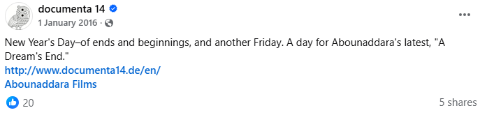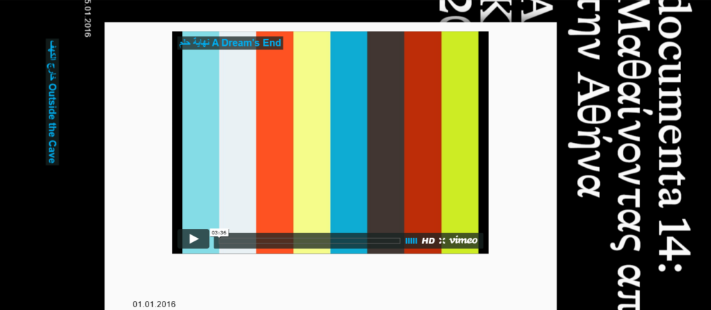 [Starting at the end of 2015, documenta 14 posted the weekly ’emergency cinema’ videos of the Syrian collective Abounaddara on its website and Facebook page. As part of A Curriculum of Imposters (Here & Now, There & Then, On & On), I am reposting these videos, as well as screenshots of the original website posts (using the ‘wayback machine’) and the documenta 14 Facebook page, as part of preparations for the ten-year anniversaty of documenta 14 in 2017. These weekly posts will also engage with a class I am teaching at This* Ohio State University about marketing, communications and social media for non-profit arts organizations, and, specifically, the right (to the) image. At the same time, I am reposting Abounaddara’s work in the year 2026 – the 250th anniversary of the 1776 Declaration of Independence and beginning of the American Revolution – as a reminder about what revoultion means for people, beyond states and their leaders – in Syria, in Greece, in Germany, in the US and around the world]