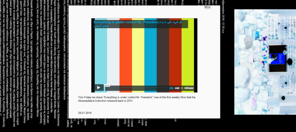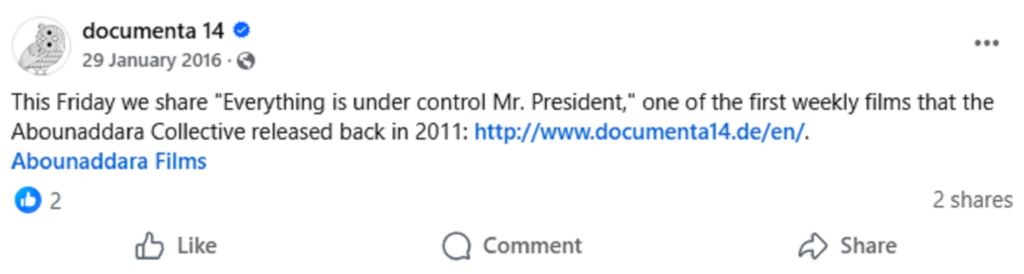 Abounaddara, Everything is under control Mr. President 30th January 2026A Curriculum of ImpostersAbounaddaraMinus Plato In another Abou Naddara video, titled “Everything is under control Mr. President,” we peer out a doorway at a man standing silently in a sun-drenched alley. After 45 seconds, the view shifts to the same man in a courtyard, seen first from a few feet away, then closer. As the image dissolves to white, a single gunshot is heard. Maybe one of the most significant things works like this can give someone sitting at a computer 5,700 miles away is a new way of emotionally grasping events that seem in many ways very distant. – أنا وبس: My People Love Me by Bruce Wallace Guernica April 15, 2012