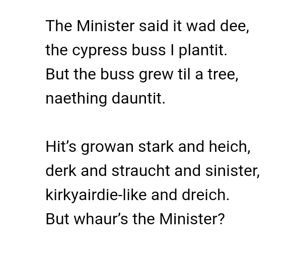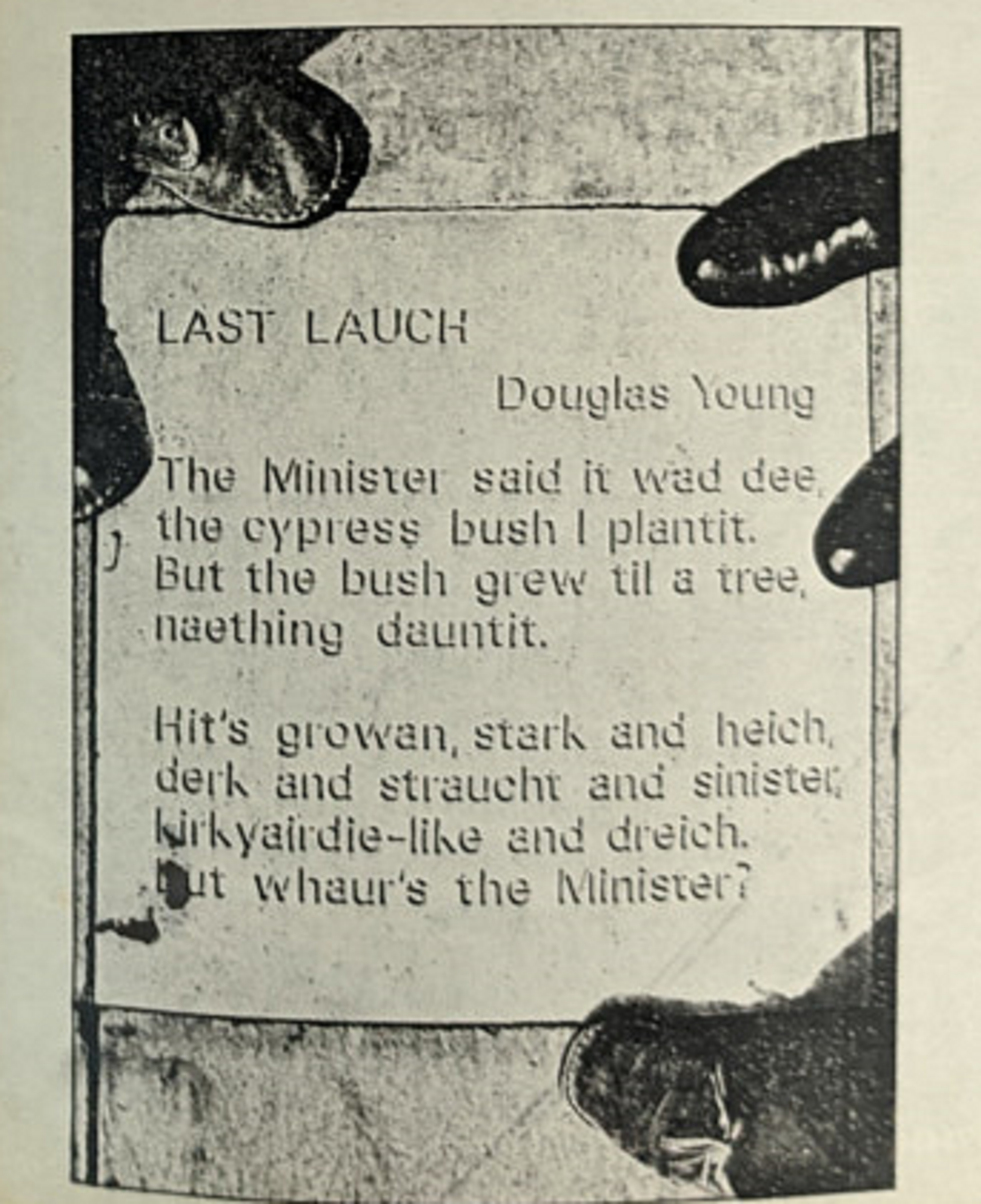 On December 30th 2023, I visited artist David Harding at his home in Glasgow. Among the things we spoke about, he told me the story of the poem called ‘The Last Lauch’ by poet and classicist Douglas Young. As town artist in Glenrothes from 1968 to 1978, Harding used some of the pavement and road building budgets of the civil engineers to cast three poems into paving slabs, which were then placed at bus stops and telephone kiosks around the town. Harding typed the poems out and sent them to each of the poets to ask for their permission. Sydney Goodsir Smith and Hugh MacDiarmid both immediately replied and Harding would later bring another slab with his poem to MacDiarmid’s house near Biggar and his wife Valda instructed him to set it in the ground at their doorstep, without delay! But Harding read some weeks after sending Young the letter, that the poet and classicist had died. He also read in Wilfred Taylor’s a piece in ‘The Scotsman’, which described the funeral service in North Carolina, where Young had been teaching Classics, that the poem that Harding had selected, ‘The Last Lauch’ was also read.